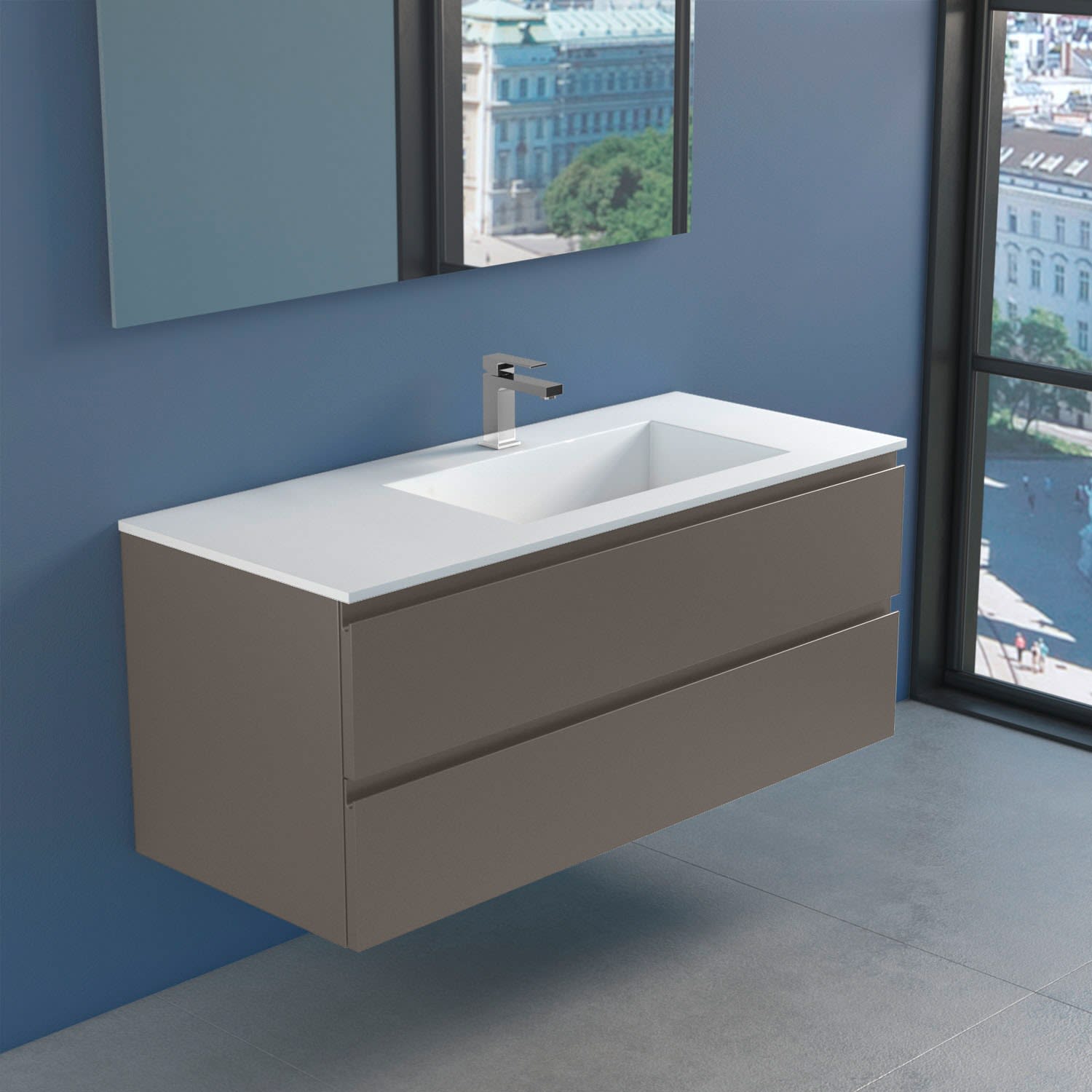 Stresa +Lago Badmöbel mit modernem und minimalistischem Design, erhältlich in vier matt lackierten Farben (weiß, schwarz, cappuccino und grau), Fronten in MDF Stärke 22 mm, mit Griffmulde und Schubladen mit Soft Closing.Waschbecken Lago 120 in Solid Matt White.