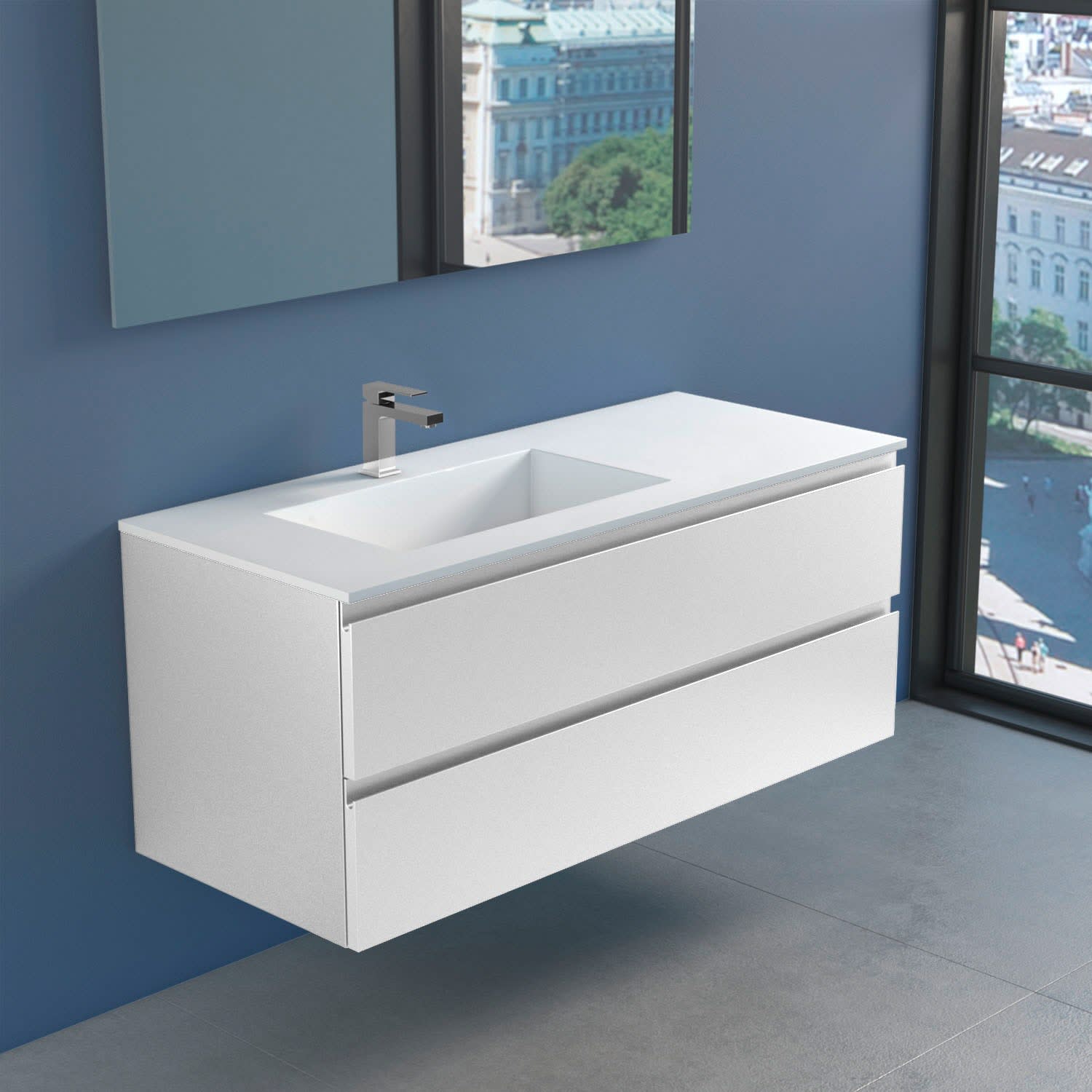 Stresa +Lago Badmöbel mit modernem und minimalistischem Design, erhältlich in vier matt lackierten Farben (weiß, schwarz, cappuccino und grau), Fronten in MDF Stärke 22 mm, mit Griffmulde und Schubladen mit Soft Closing.Waschbecken Lago 120 in Solid Matt White.