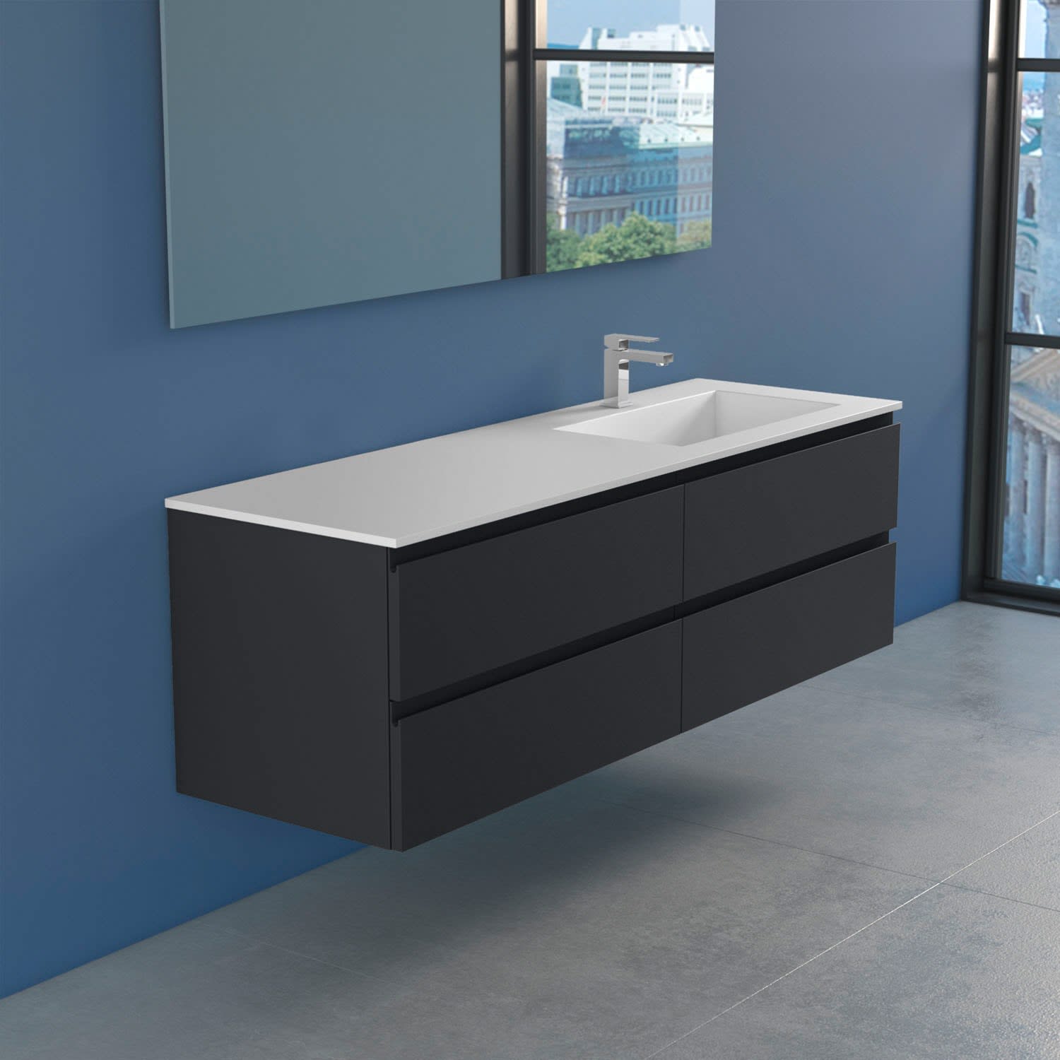 Stresa +Lago Badmöbel mit modernem und minimalistischem Design, erhältlich in vier matt lackierten Farben (weiß, schwarz, cappuccino und grau), Fronten in MDF Stärke 22 mm, mit Griffmulde und Schubladen mit Soft Closing.Waschbecken Lago 160 in Solid Matt White.