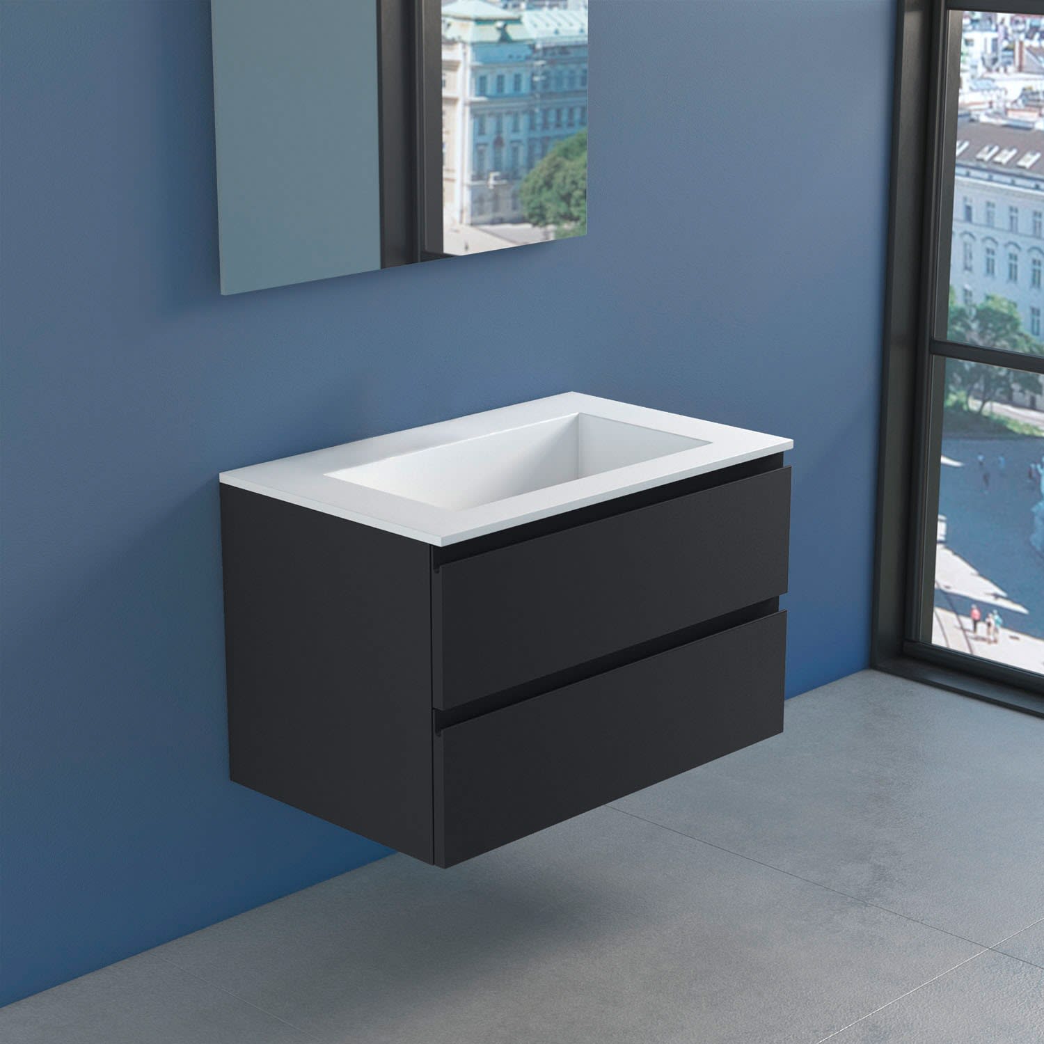 Stresa +Lago Badmöbel mit modernem und minimalistischem Design, erhältlich in vier matt lackierten Farben (weiß, schwarz, cappuccino und grau), Fronten in MDF Stärke 22 mm, mit Griffmulde und Schubladen mit Soft Closing.Waschbecken Lago 80 in Solid Matt White.