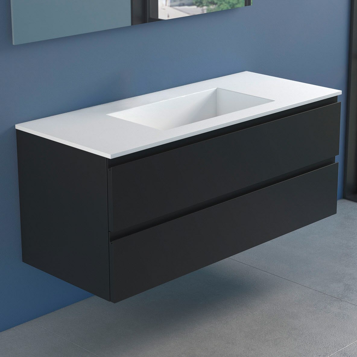 Stresa +Lago Badmöbel mit modernem und minimalistischem Design, erhältlich in vier matt lackierten Farben (weiß, schwarz, cappuccino und grau), Fronten in MDF Stärke 22 mm, mit Griffmulde und Schubladen mit Soft Closing.Waschbecken Lago 120 in Solid Matt White.