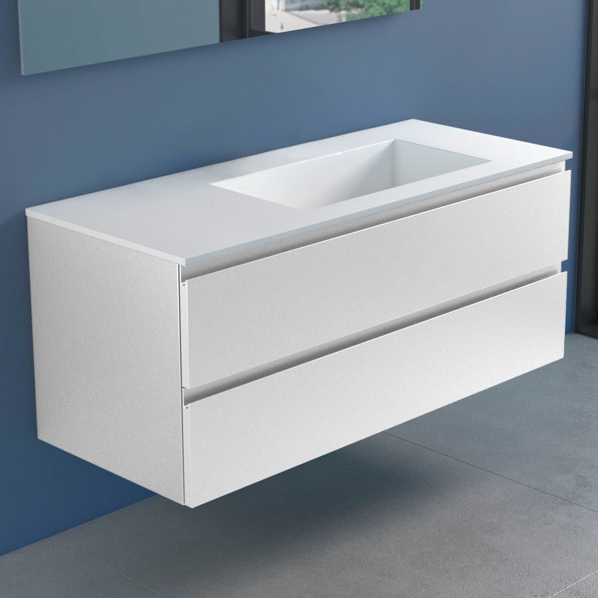 Stresa +Lago Badmöbel mit modernem und minimalistischem Design, erhältlich in vier matt lackierten Farben (weiß, schwarz, cappuccino und grau), Fronten in MDF Stärke 22 mm, mit Griffmulde und Schubladen mit Soft Closing.Waschbecken Lago 120 in Solid Matt White.