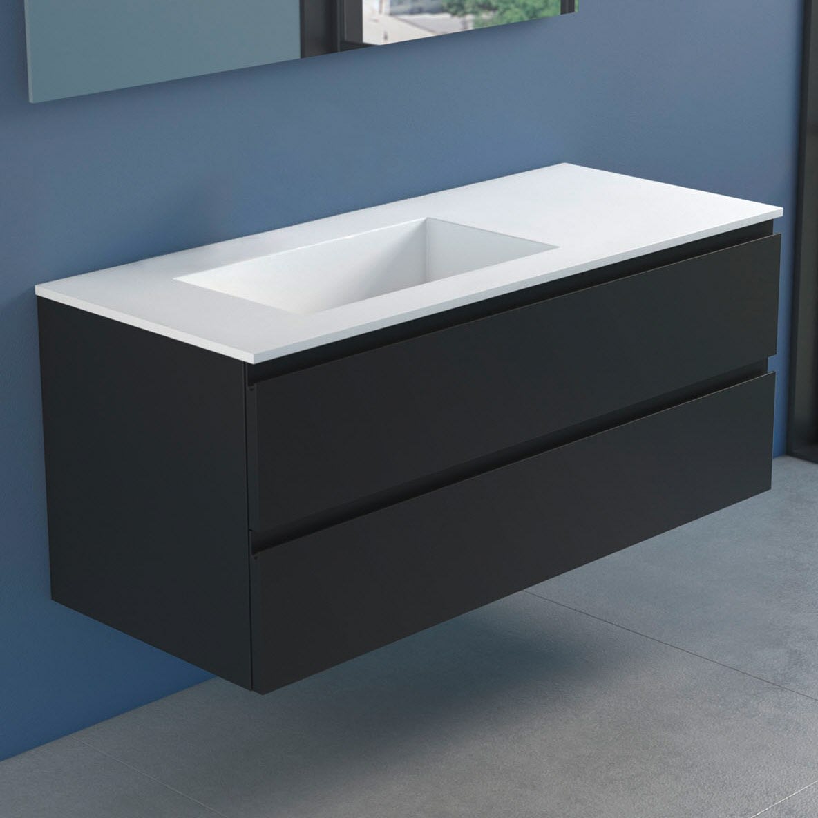 Stresa +Lago Badmöbel mit modernem und minimalistischem Design, erhältlich in vier matt lackierten Farben (weiß, schwarz, cappuccino und grau), Fronten in MDF Stärke 22 mm, mit Griffmulde und Schubladen mit Soft Closing.Waschbecken Lago 120 in Solid Matt White.