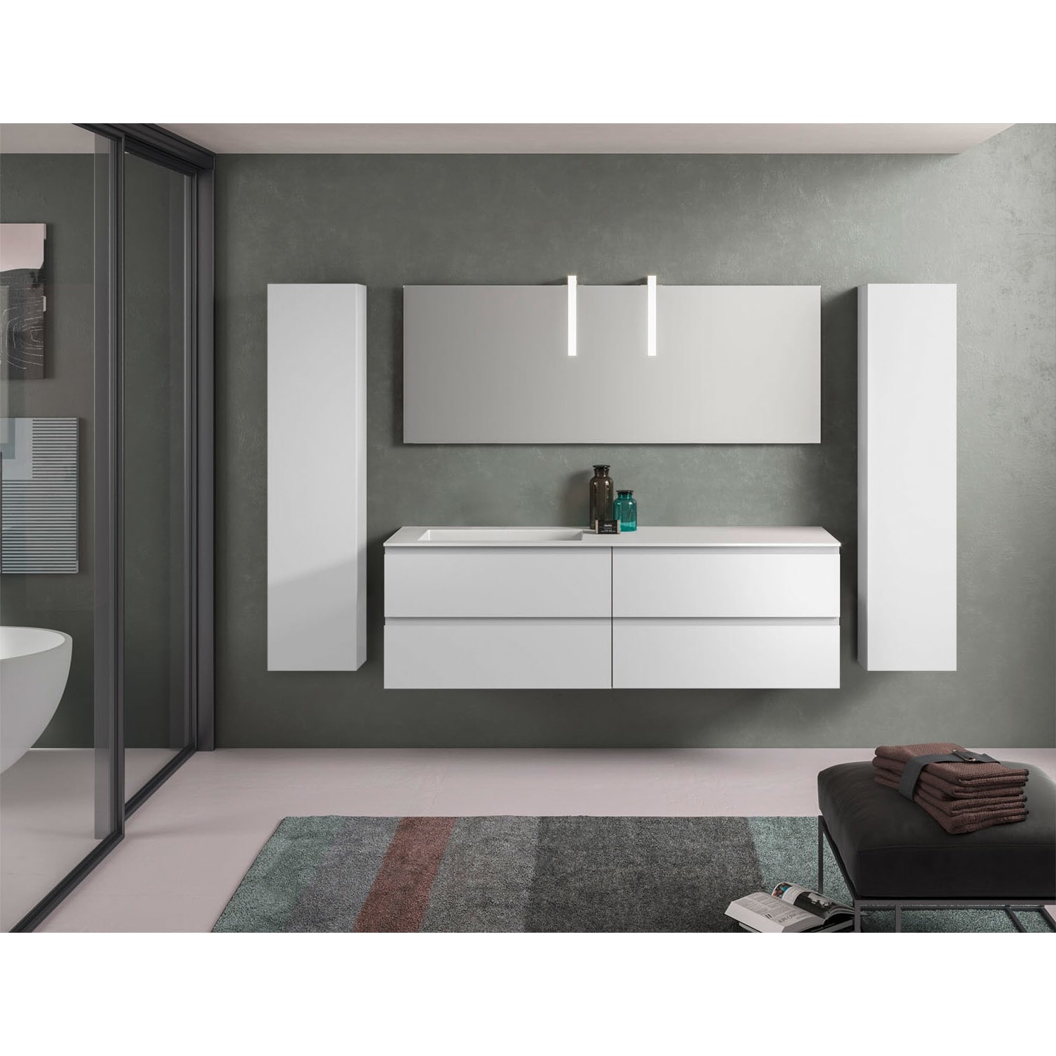 Stresa +Lago Badmöbel mit modernem und minimalistischem Design, erhältlich in vier matt lackierten Farben (weiß, schwarz, cappuccino und grau), Fronten in MDF Stärke 22 mm, mit Griffmulde und Schubladen mit Soft Closing.Waschbecken Lago 160 in Solid Matt White.