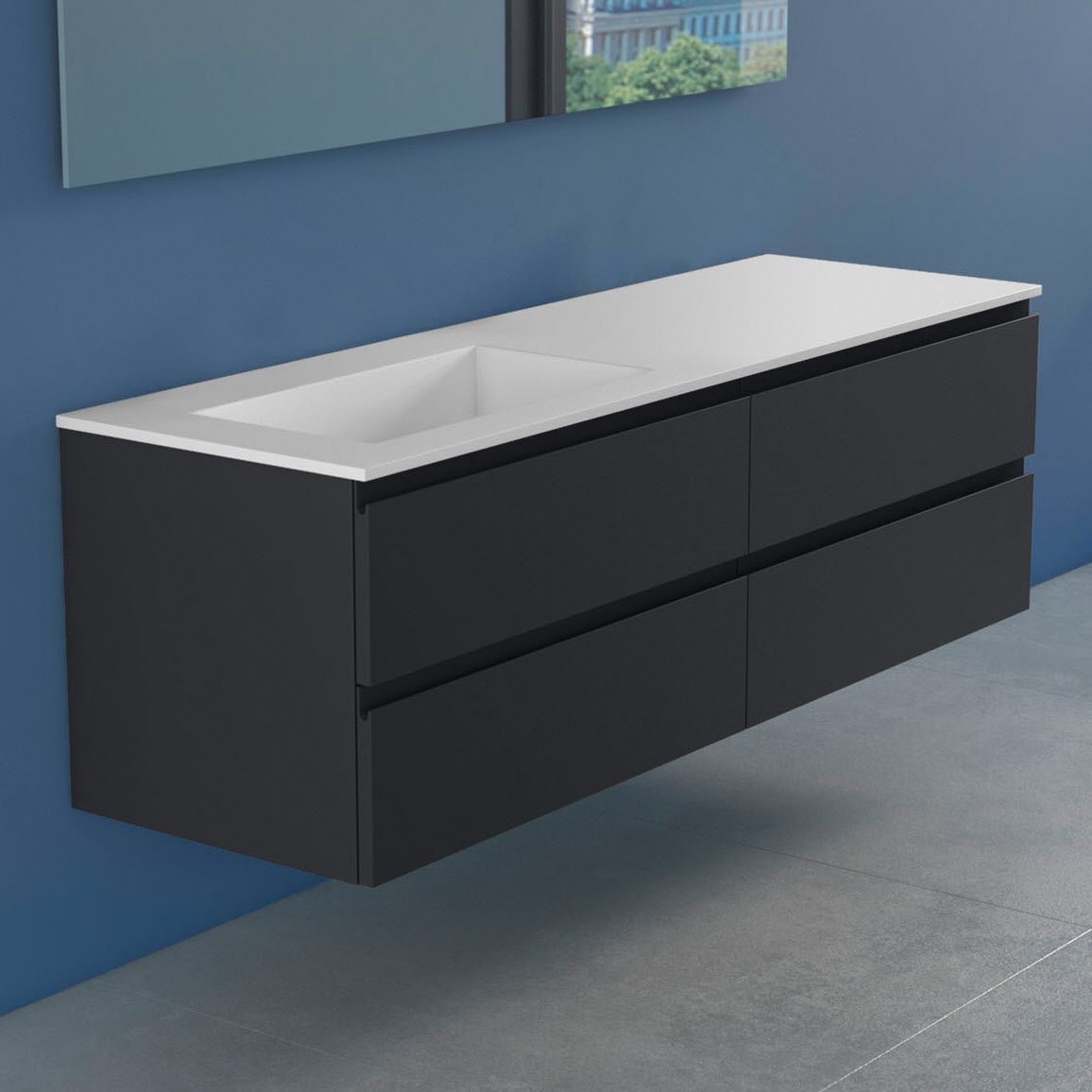 Stresa +Lago Badmöbel mit modernem und minimalistischem Design, erhältlich in vier matt lackierten Farben (weiß, schwarz, cappuccino und grau), Fronten in MDF Stärke 22 mm, mit Griffmulde und Schubladen mit Soft Closing.Waschbecken Lago 160 in Solid Matt White.