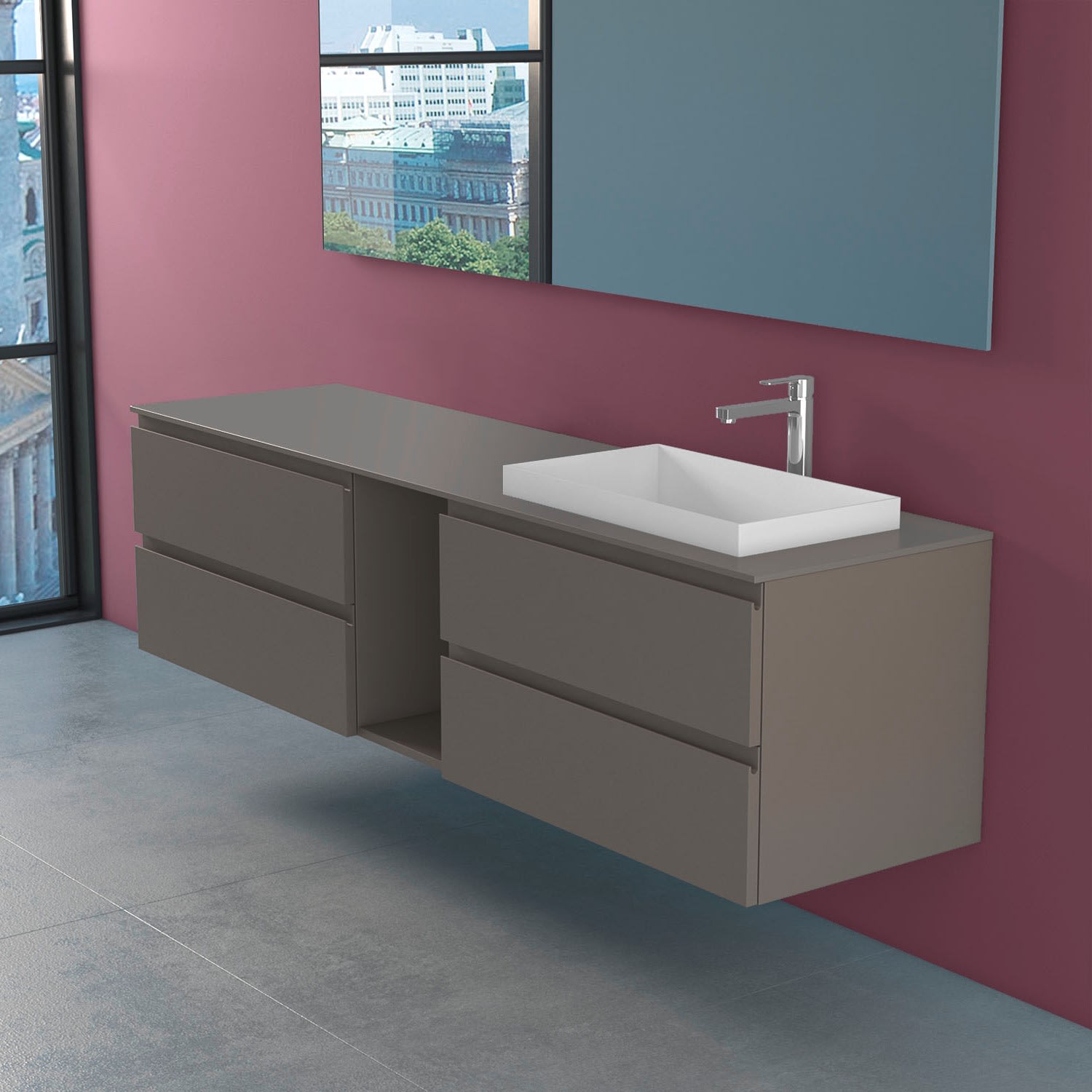 Stresa + ELY Badezimmerschrank mit modernem und minimalistischem Design, erhältlich in vier matt lackierten Farben, (weiß BI, schwarz NE, cappuccino CP, gallet grau GG) Fronten in mdf Stärke 22 mm, mit Griffmulde und Schubladen mit Soft Closing. Glasplatte aus 12 mm starkem, matt satiniertem, kratzfestem Kristallglas.Waschbecken Ely 60 in Solid Matt White