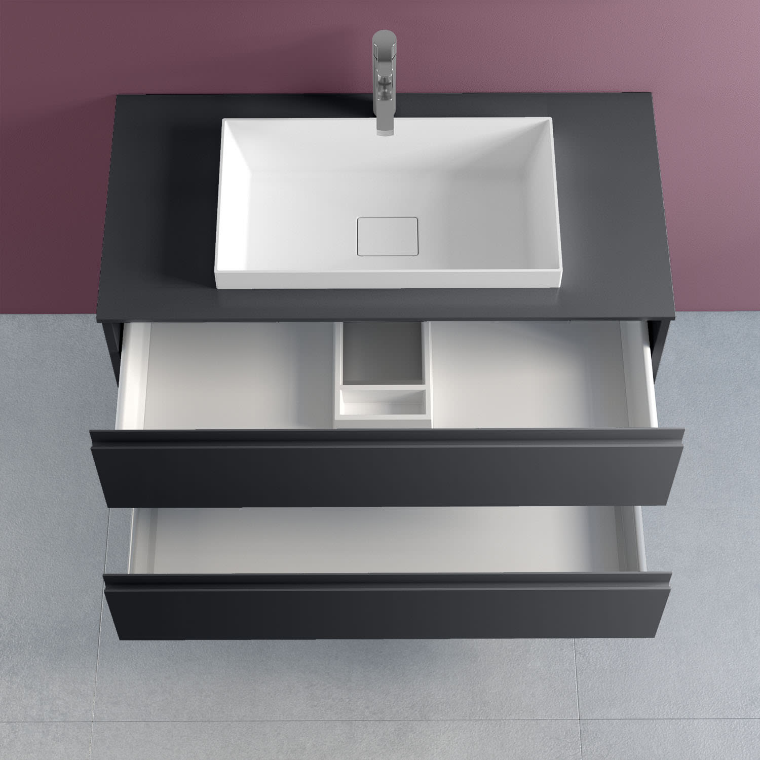 Stresa + ELY Badezimmerschrank mit modernem und minimalistischem Design, erhältlich in vier matt lackierten Farben, (weiß BI, schwarz NE, cappuccino CP, gallet grau GG) Fronten in mdf Stärke 22 mm, mit Griffmulde und Schubladen mit Soft Closing. Glasplatte aus 12 mm starkem, matt satiniertem, kratzfestem Kristallglas.Waschbecken Ely 60 in Solid Matt White
