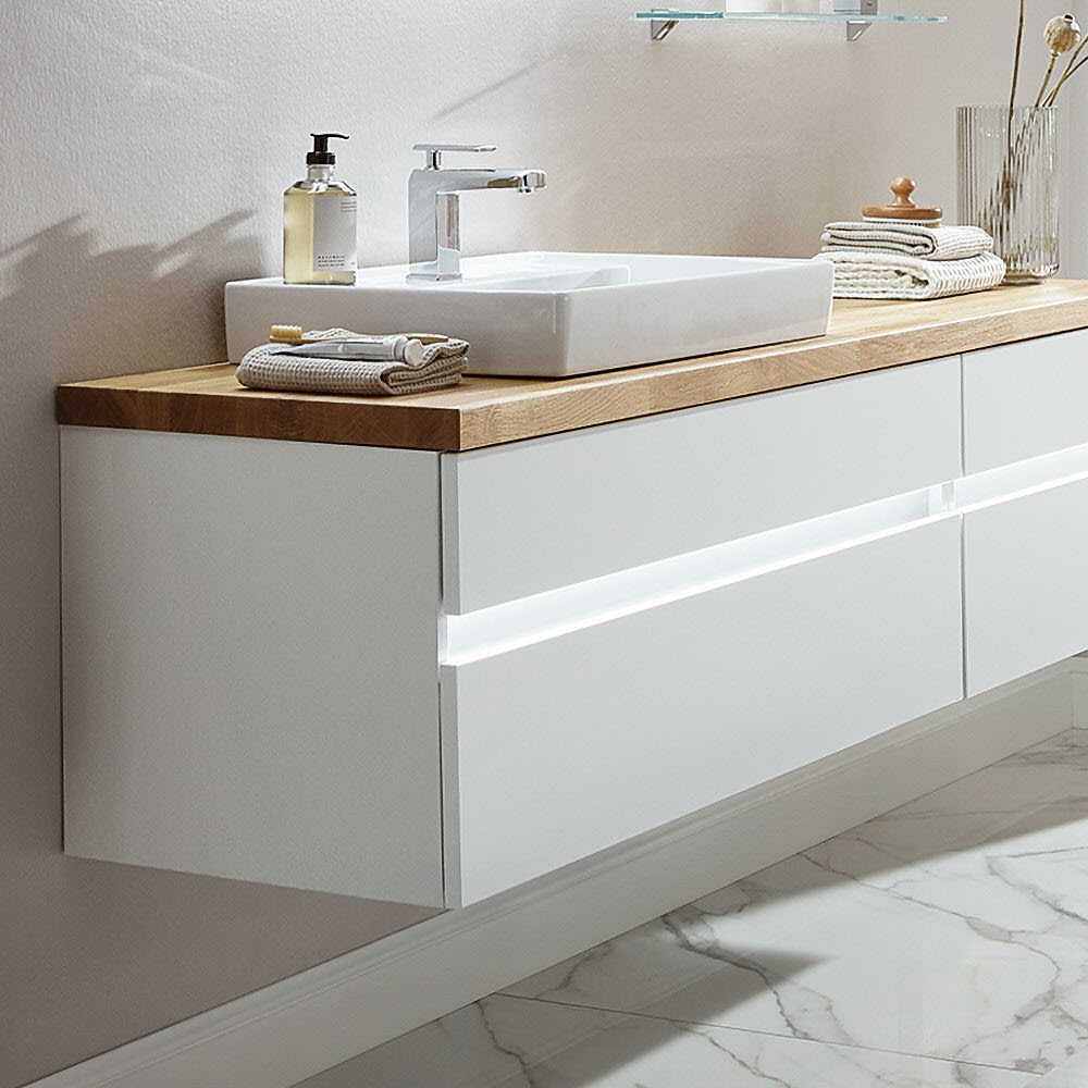 Puris b • essence Set mit Waschtischunterschrank links, Unterschrank und Waschtischplatte 161,2 cm, mit LED-Beleuchtung, Griff 342