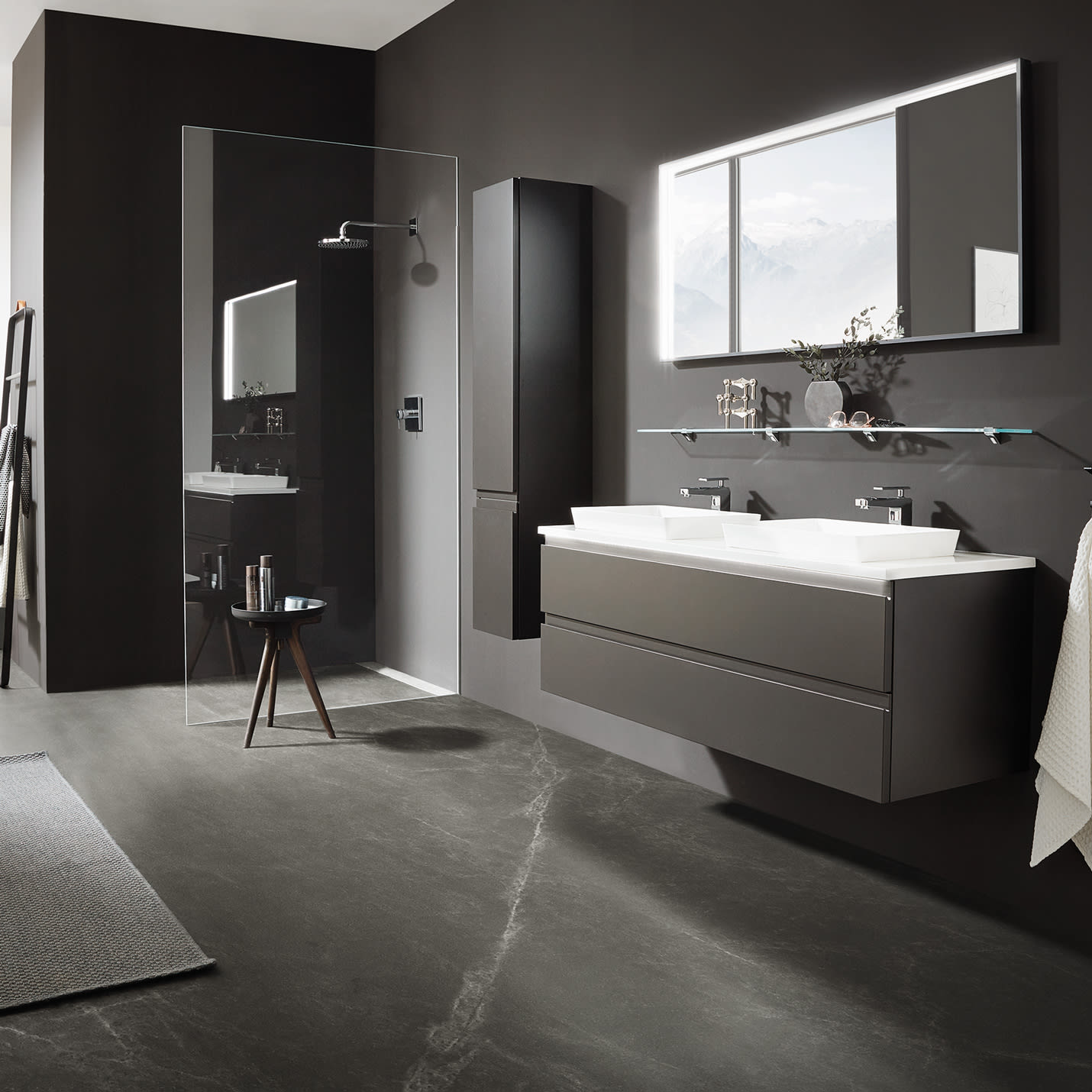 Puris b • straight Badspiegel 140 cm mit LED-Flächenleuchte in schwarz matt eloxiert