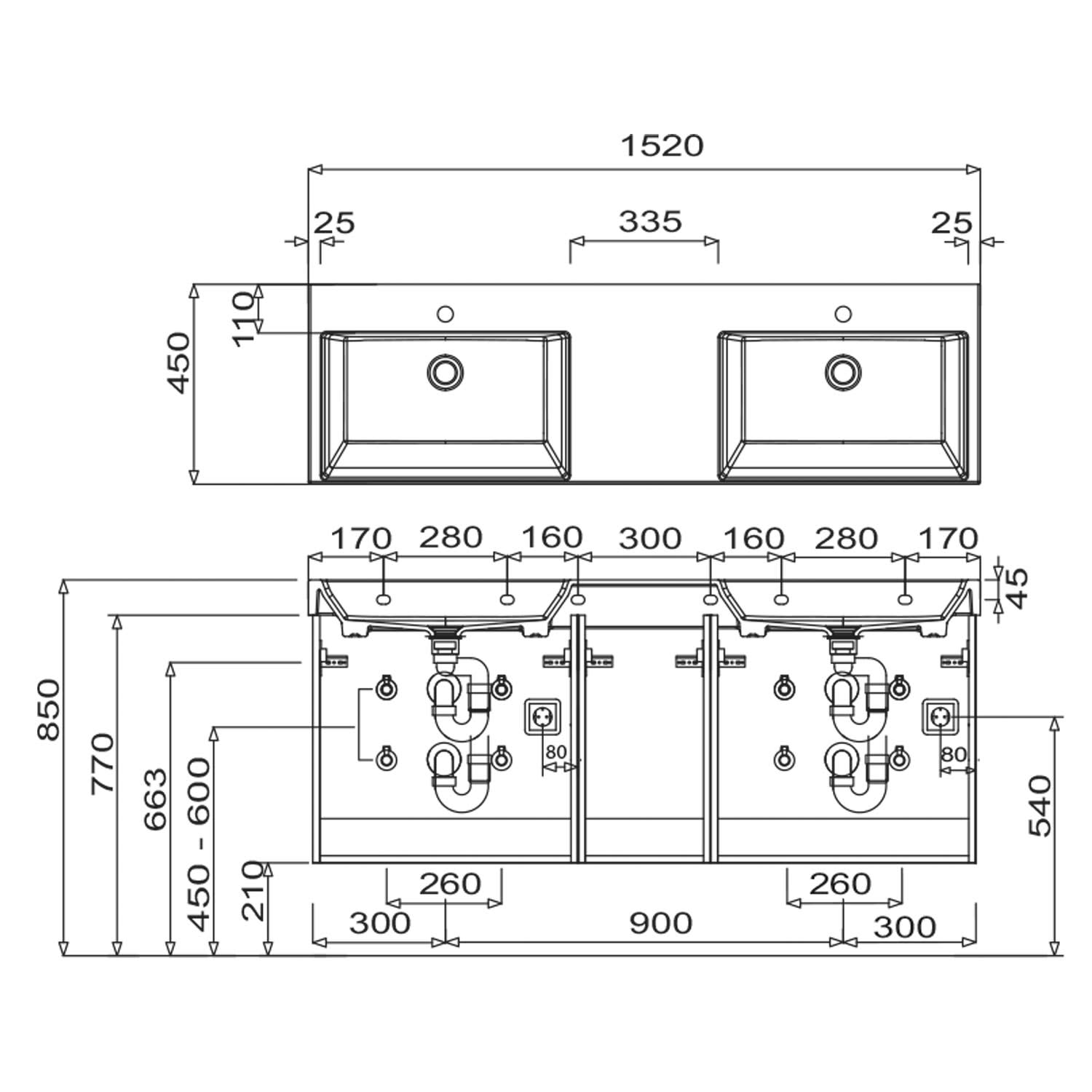 - oberer Auszug rechts und links mit Siphonausschnitt