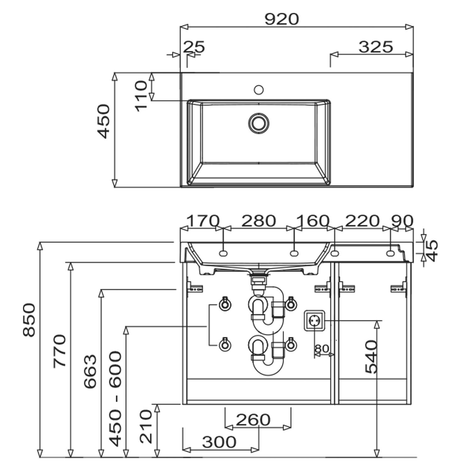 - oberer Auszug des Waschtischunterschrankes mit Siphonausschnitt
