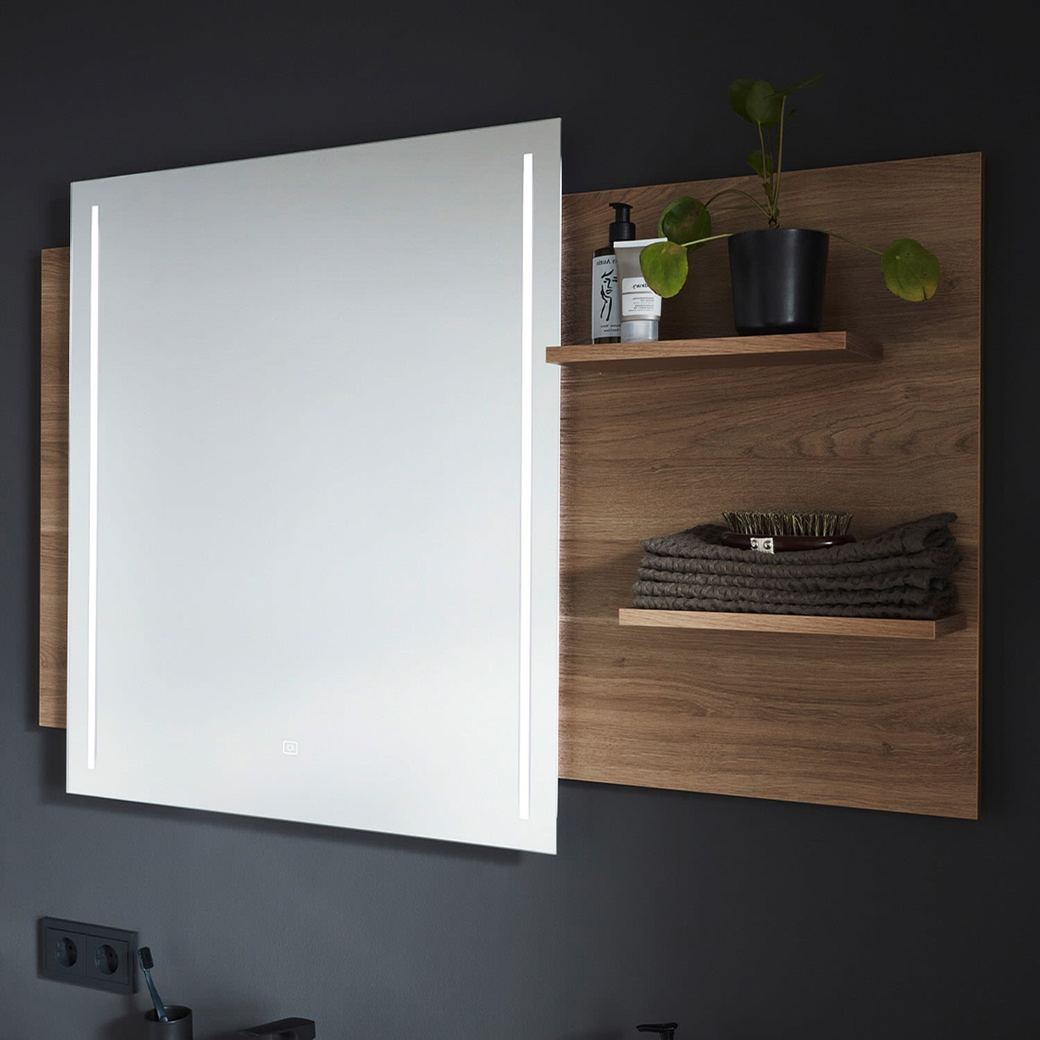 Puris c!mano Flächenspiegel 120 x 80 cm mit 2 LED Streifen und Ablagen rechts