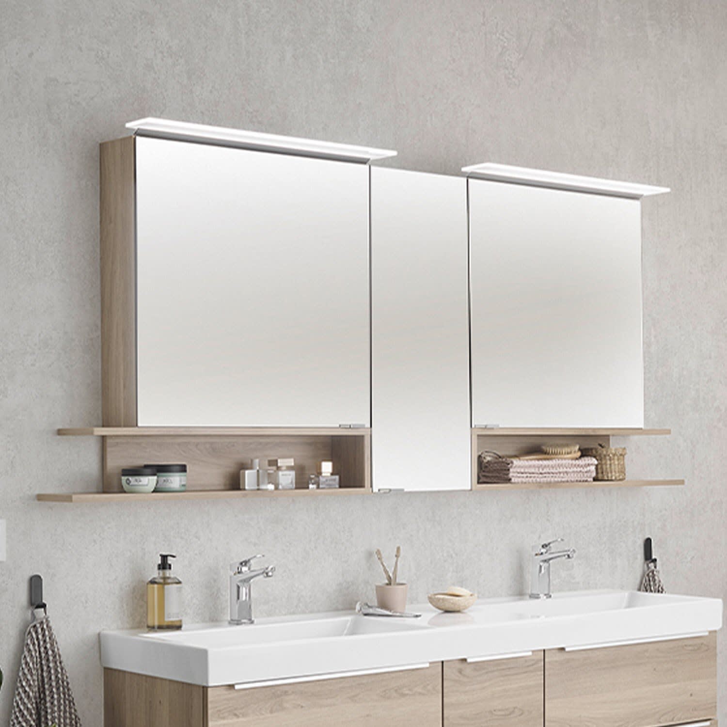 Puris c!mano Serie A Spiegelschrank 150 x 80 cm mit 3 Türen und 2 Regalen beidseitig geöffnet