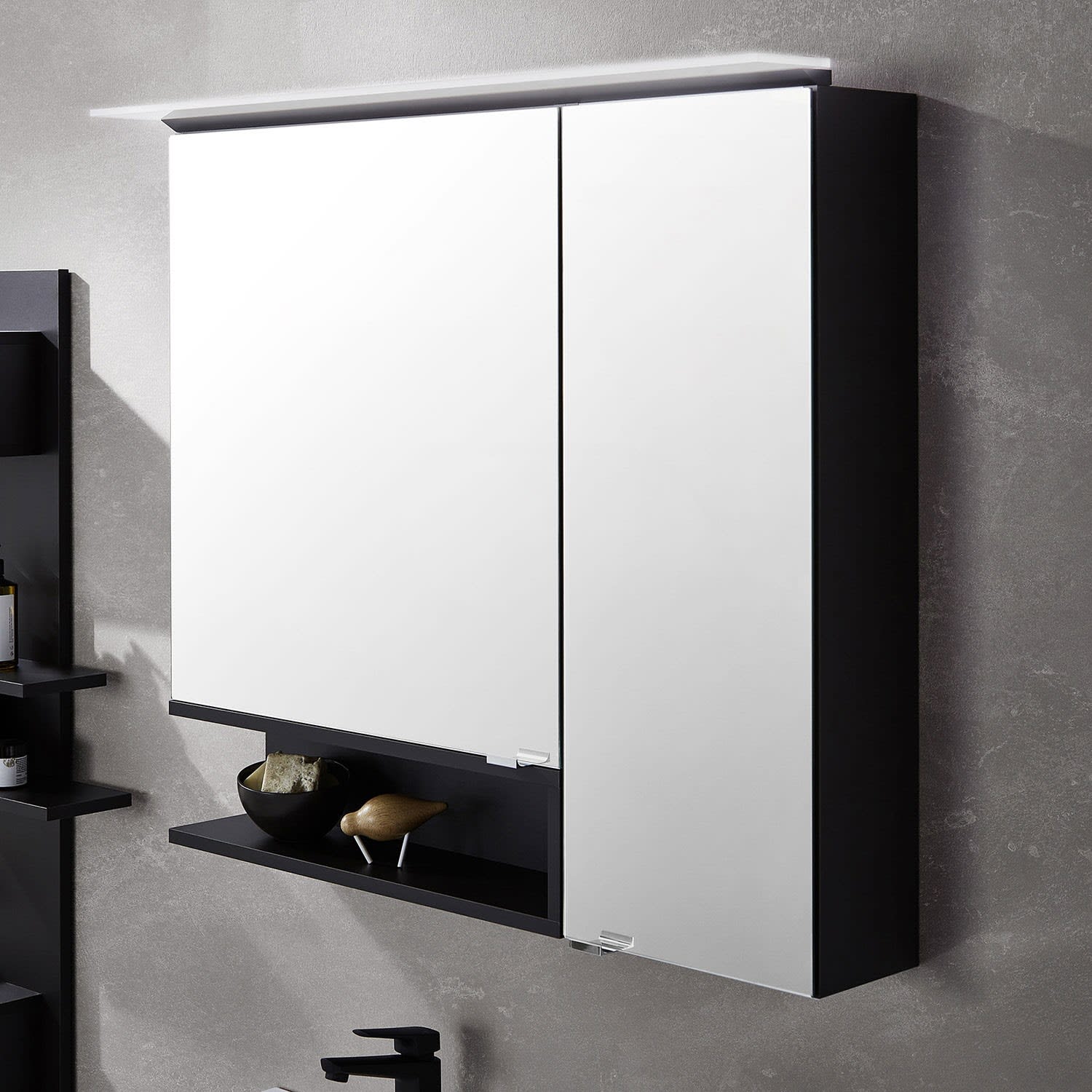 Puris c!puro Serie A Spiegelschrank 90 x 80 cm mit 2 Türen und Regal links geöffnet
