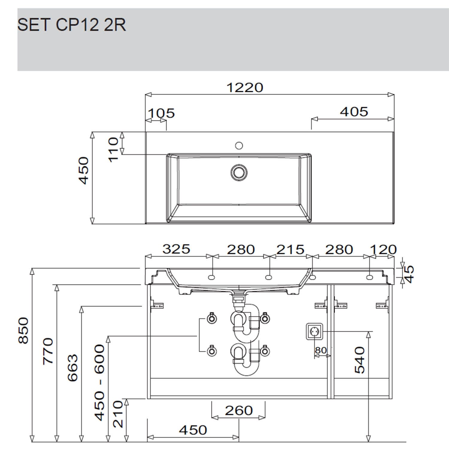 Puris c!puro Waschtischset 122 cm mit Waschtisch, Ablage rechts und Unterschränken mit 4 Auszügen, Griff 351