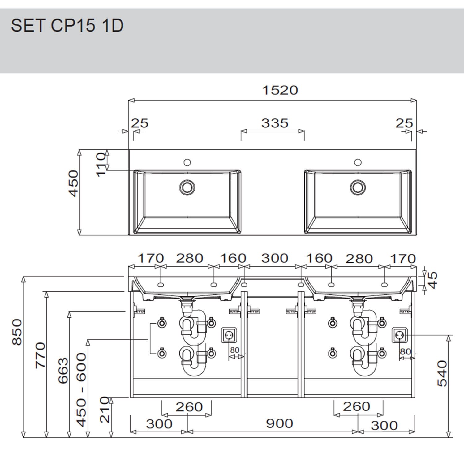 Puris c!puro Waschtischset 152 cm mit Doppelwaschtisch und Unterschränken mit 6 Auszügen, Griff 351
