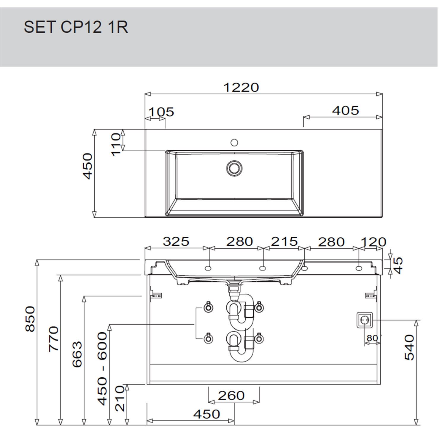 Puris c!puro Waschtischset 122 cm mit Waschtisch, Ablage rechts und Waschtischunterschrank mit 2 Auszügen, Griff 352