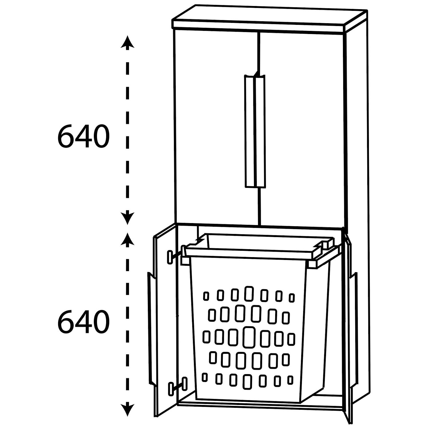 - 1 Wäscheauszug mit Kunststoffkorb 40 Liter hinter 2 gegenüberliegenden Türen mit gedämpften Scharnieren
