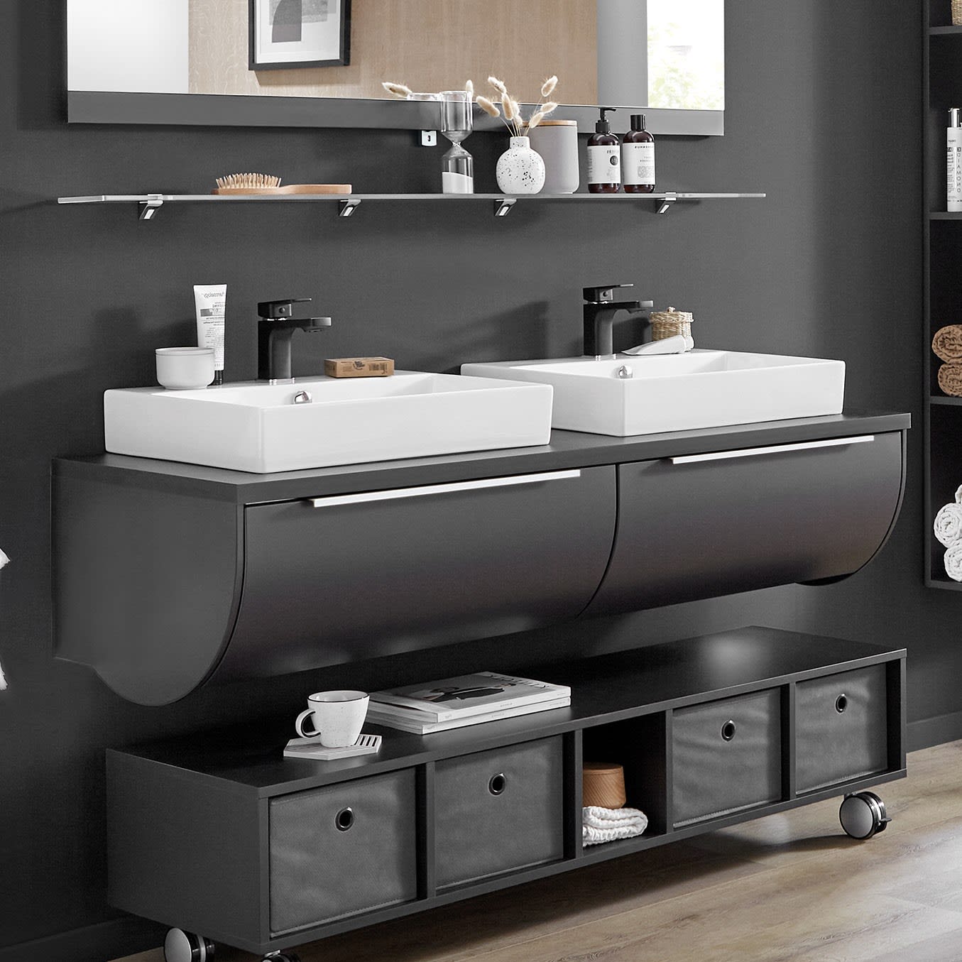 - für Doppelwaschtischlösung mit Aufsatzwaschtischen auf Waschtischplatten (bitte separat aus dem Zubehör bestellen)