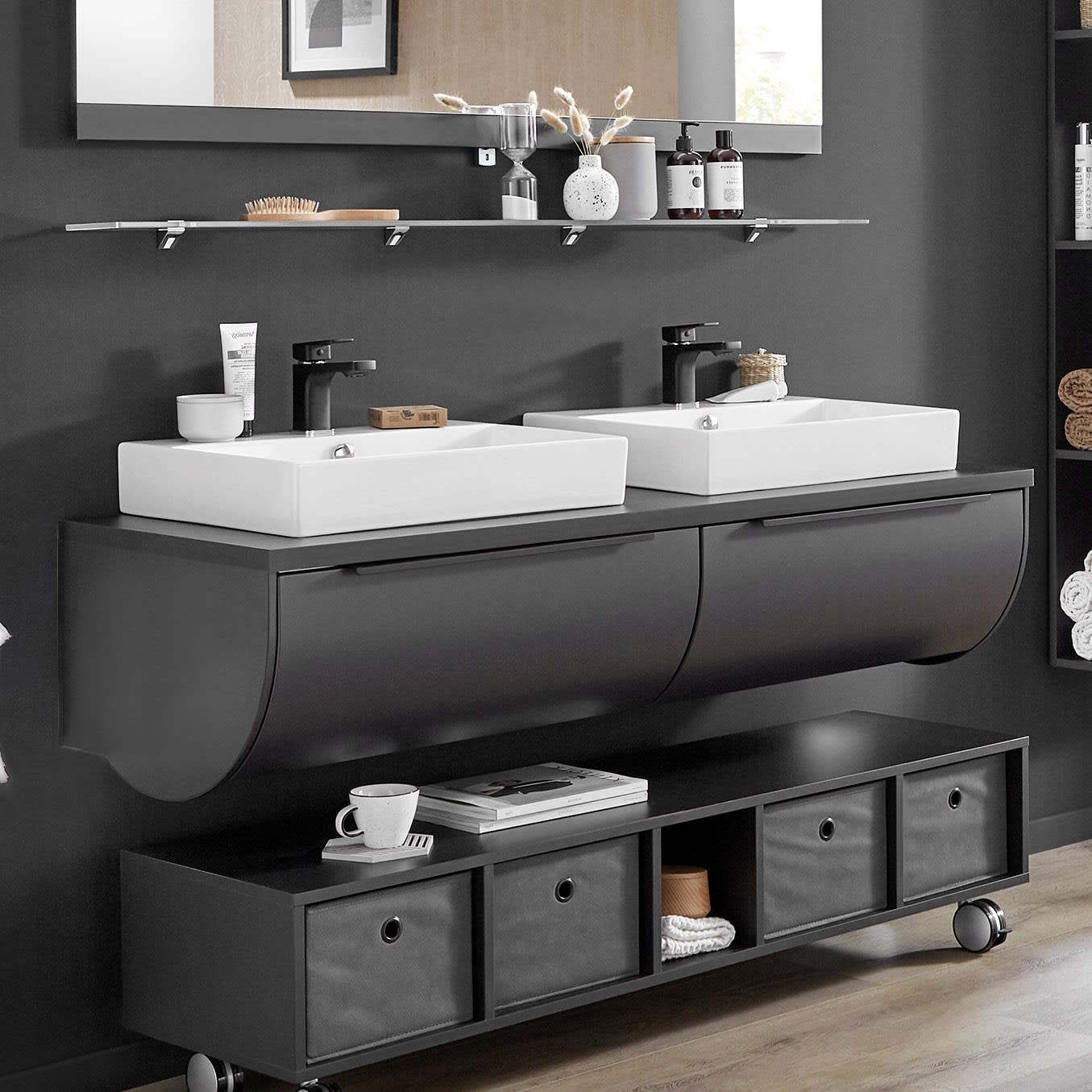 - für Doppelwaschtischlösung mit Aufsatzwaschtischen auf Waschtischplatten (bitte separat aus dem Zubehör bestellen)