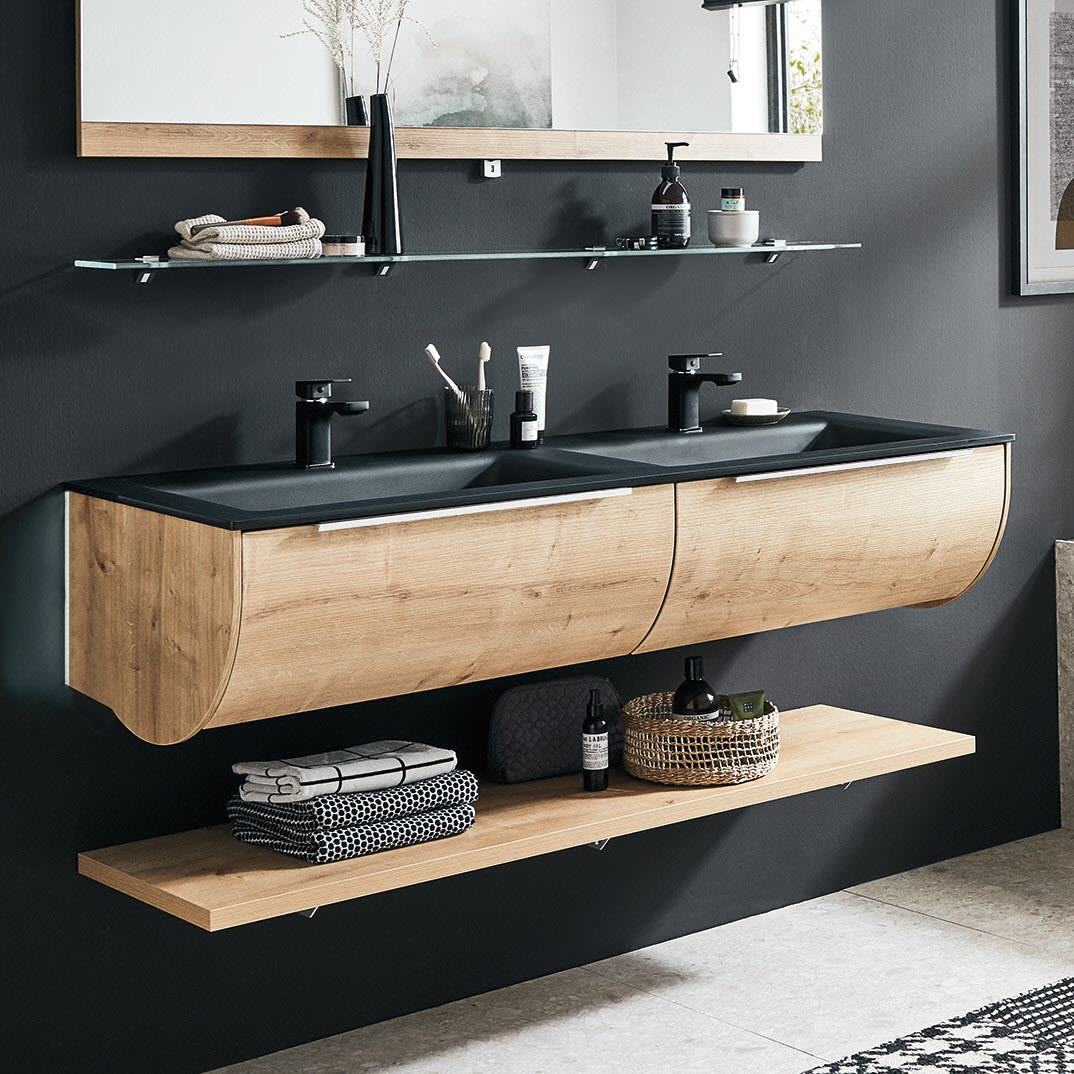 Puris Rounds Waschtischunterschrank für Doppel-Möbelwaschtisch 142 cm mit 2 Auszügen, Griff 329, mit LED-Beleuchtung