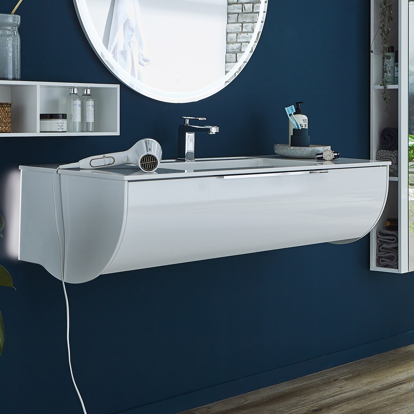 Puris Rounds Waschtischunterschrank für Möbelwaschtisch 122 cm mit 1 Auszug, Griff 329, mit LED-Beleuchtung