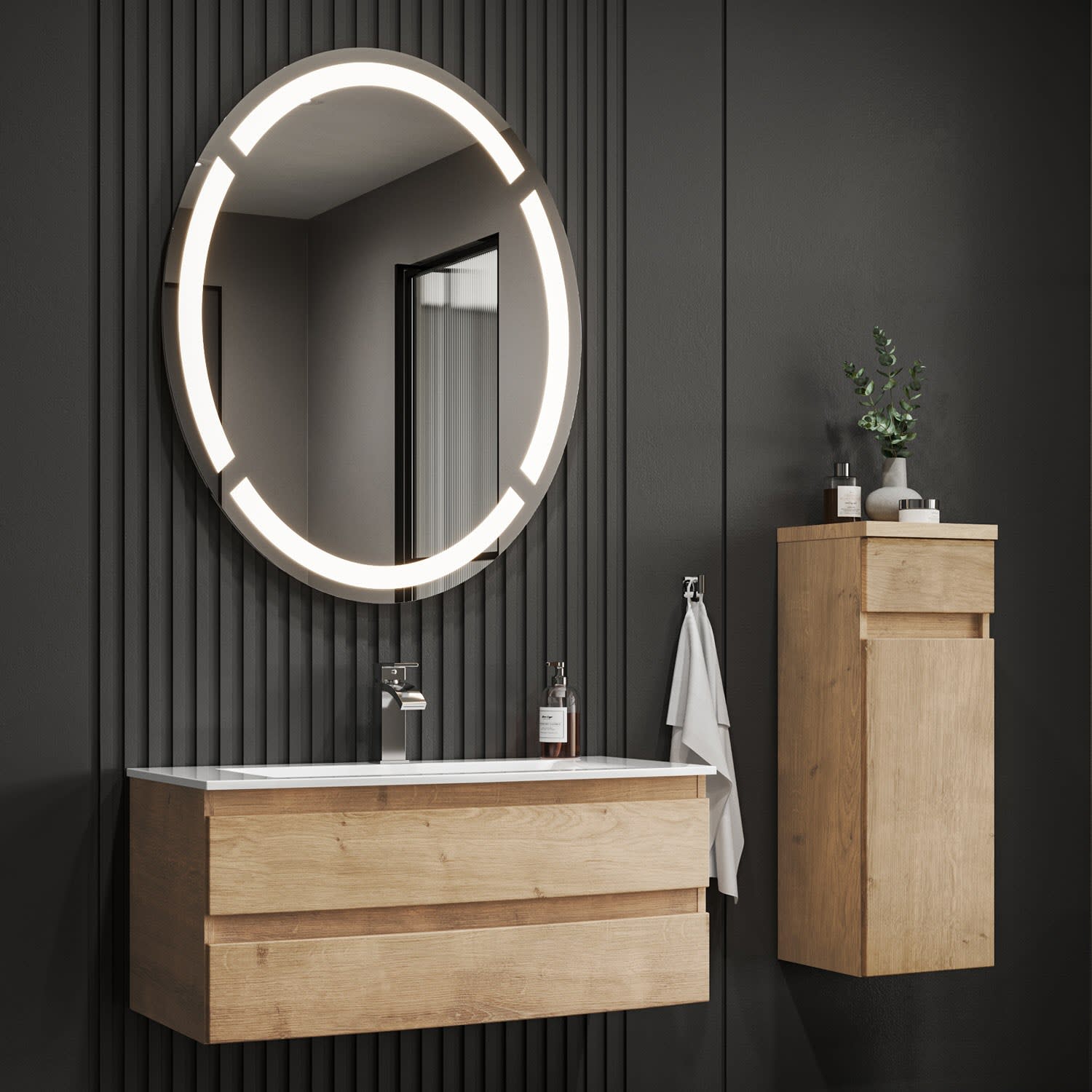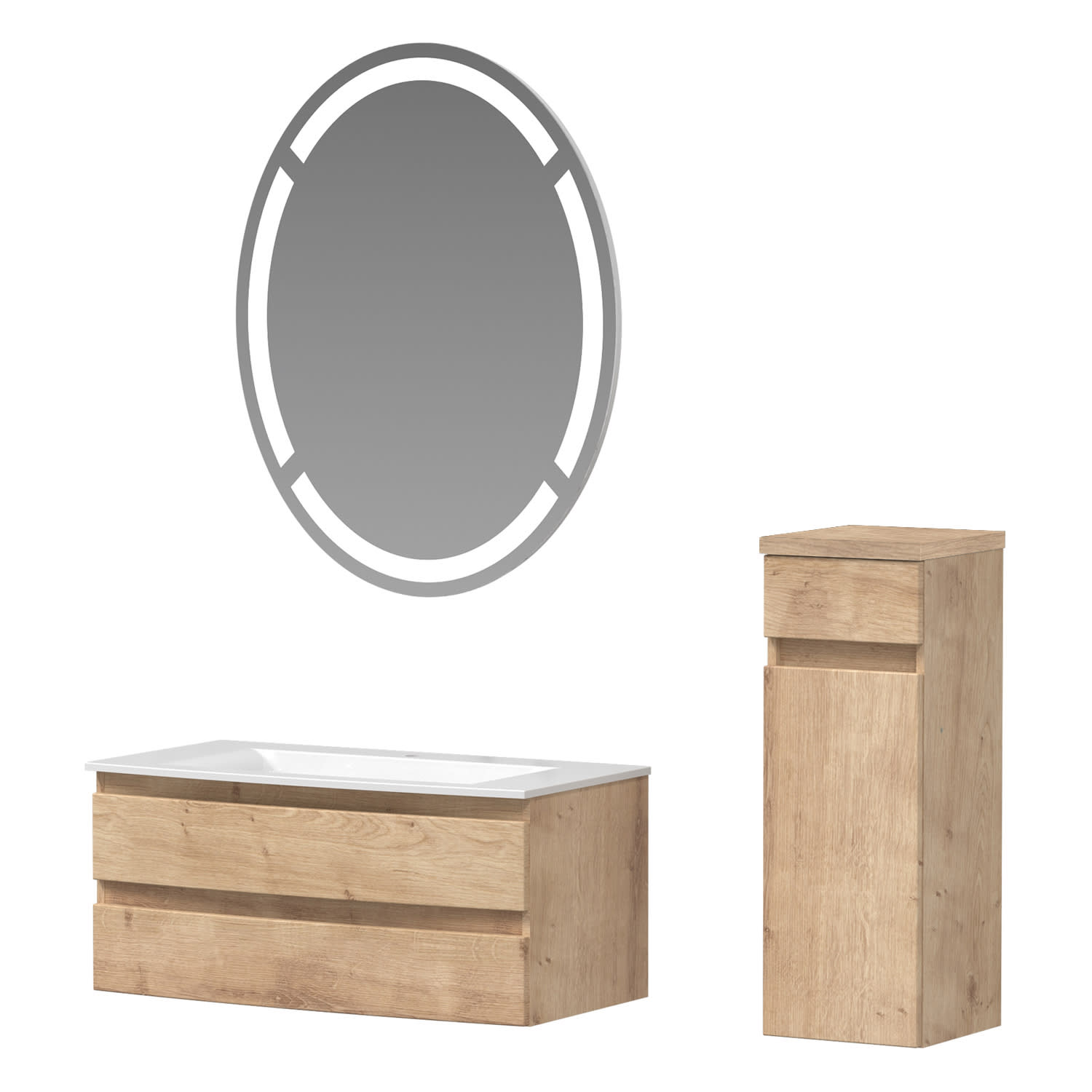 Puris Vora Badmöbel-Set 91,2 cm inkl. Flächenspiegel oval, Highboard mit Wäschekippe