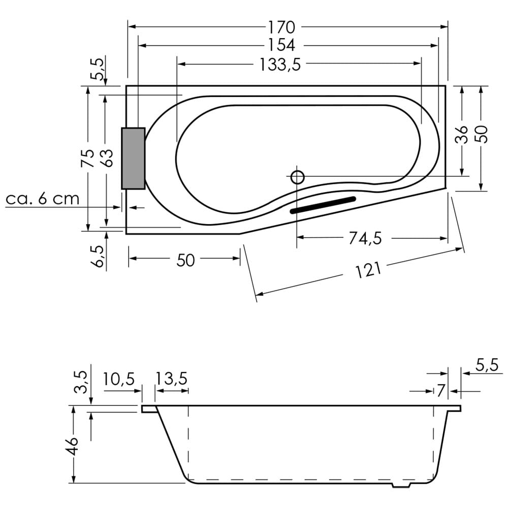 Repabad Tika Raumspar-Badewanne 170 x 75 cm mit Aquapunktur und Wannenbefüllung Trio Ablaufgarnitur, Ausführung rechts