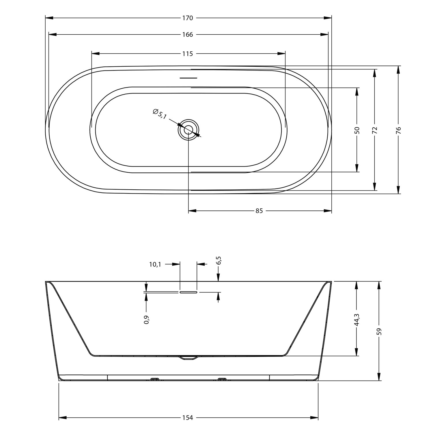 - inkl. Füße, Pop-Up Ablaufventil in Wanneninnenfarbe, Siphon und Überlaufabdeckung in chrom