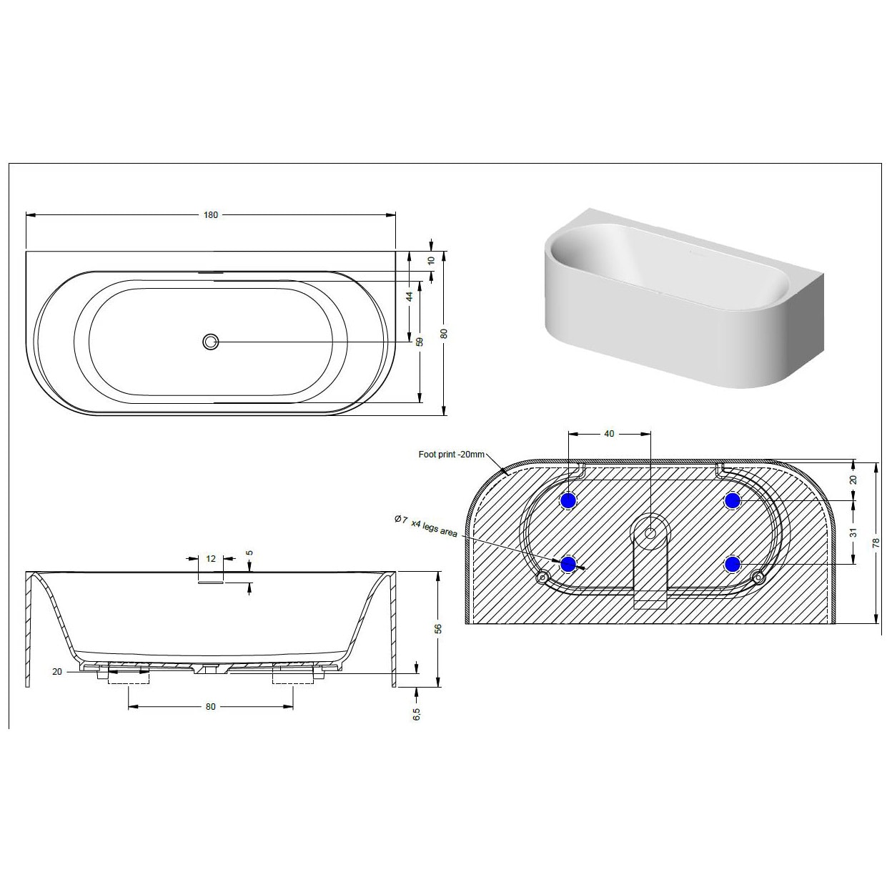 - Badewanne 180 x 80 cm, aus Solid Surface