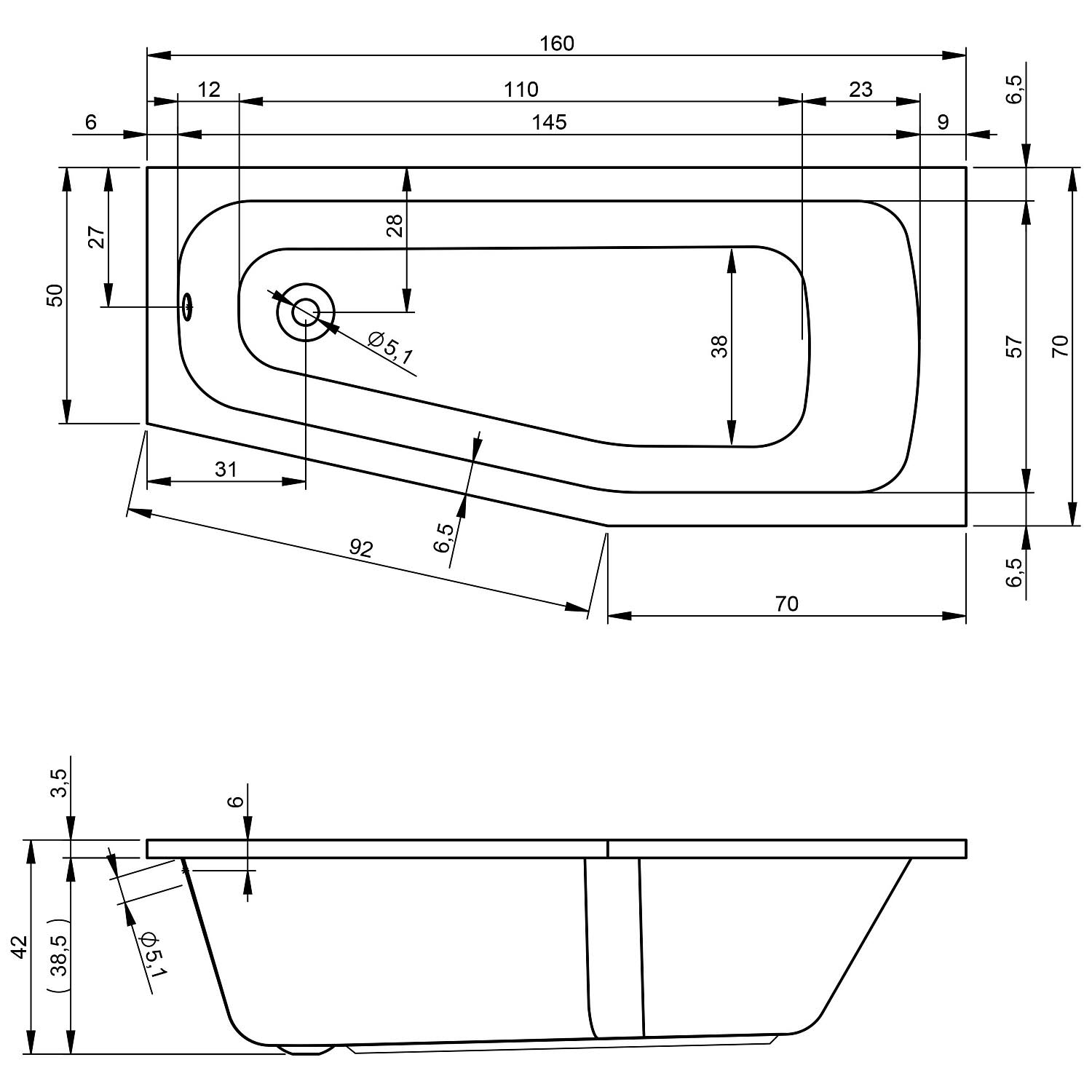 - Badewanne-Form: asymmetrisch links