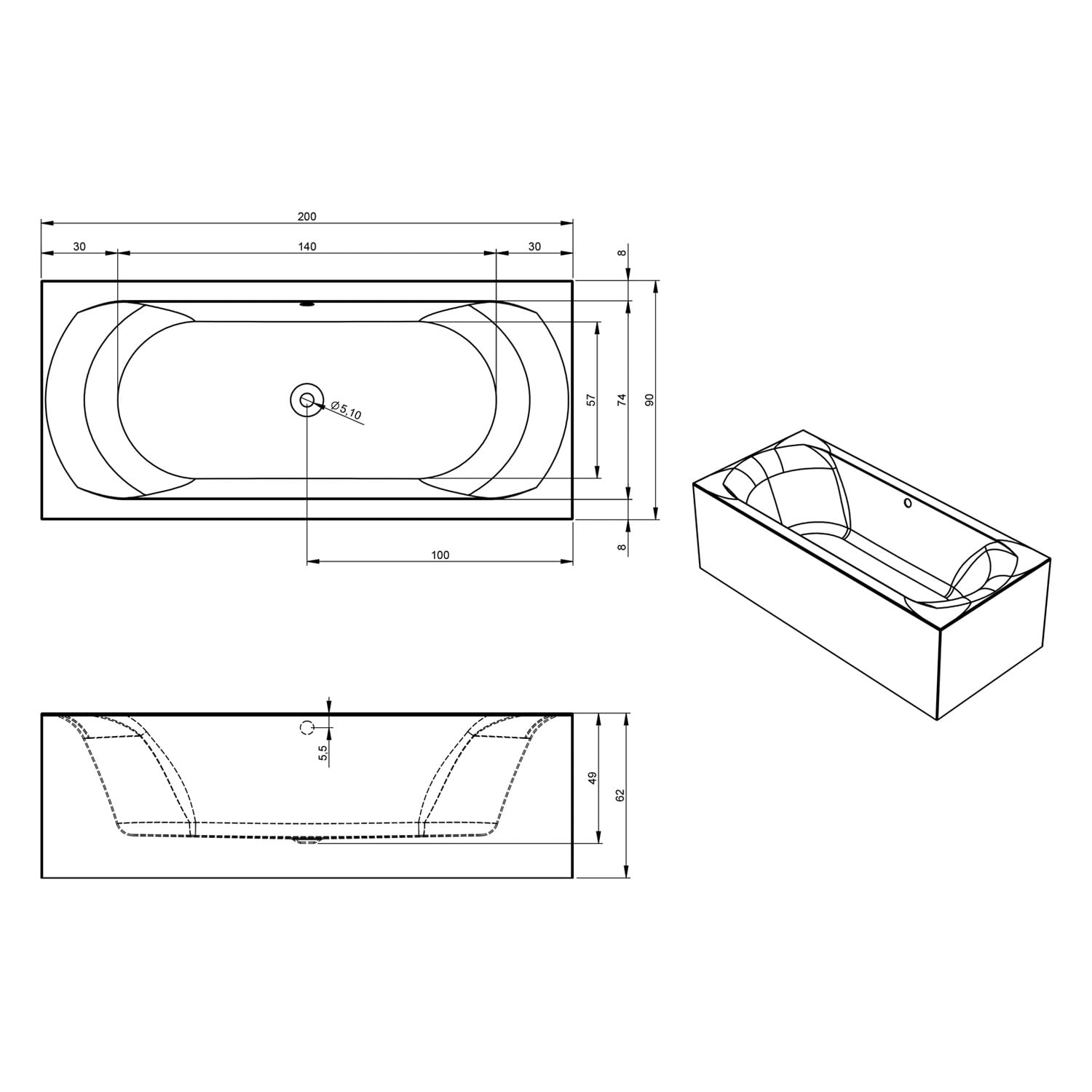 L: 200 B: 90 H: 62 cm