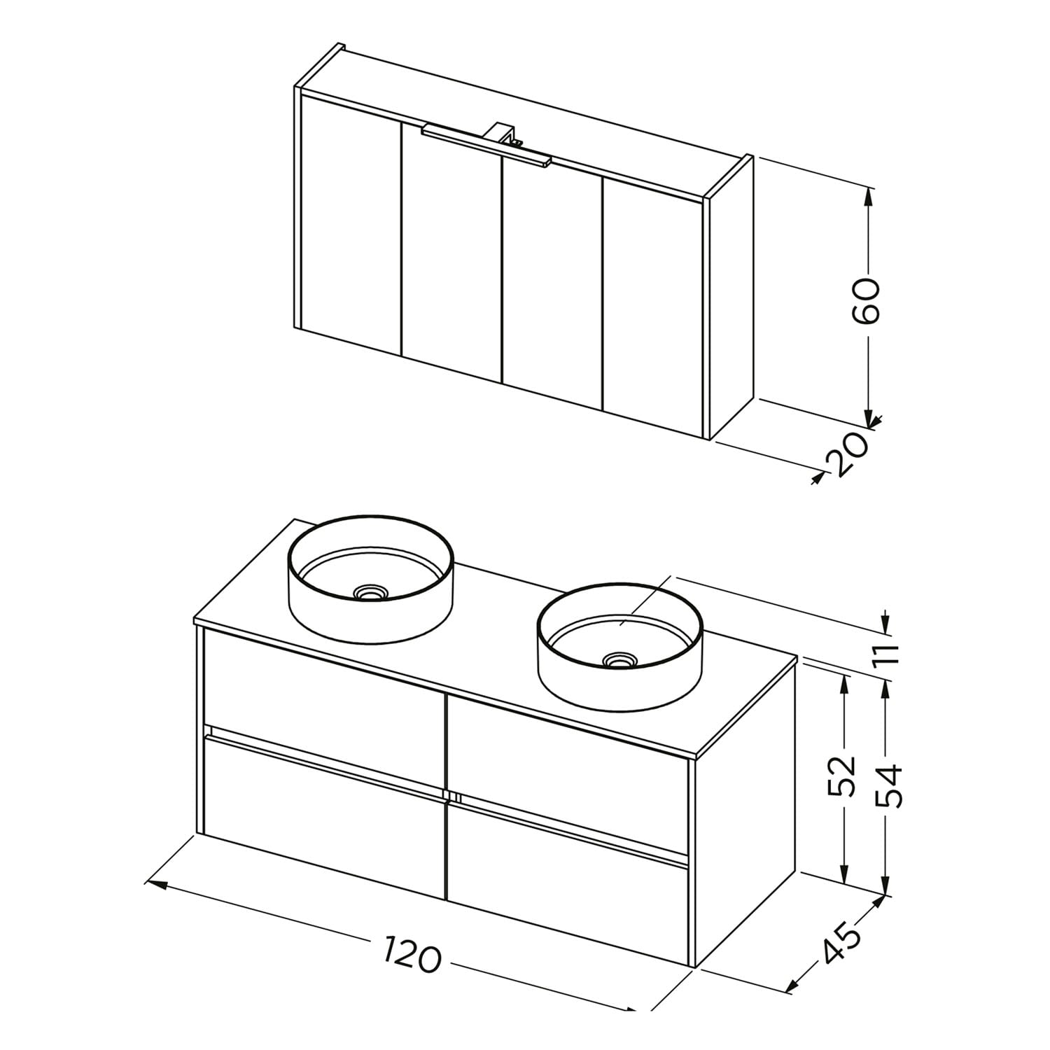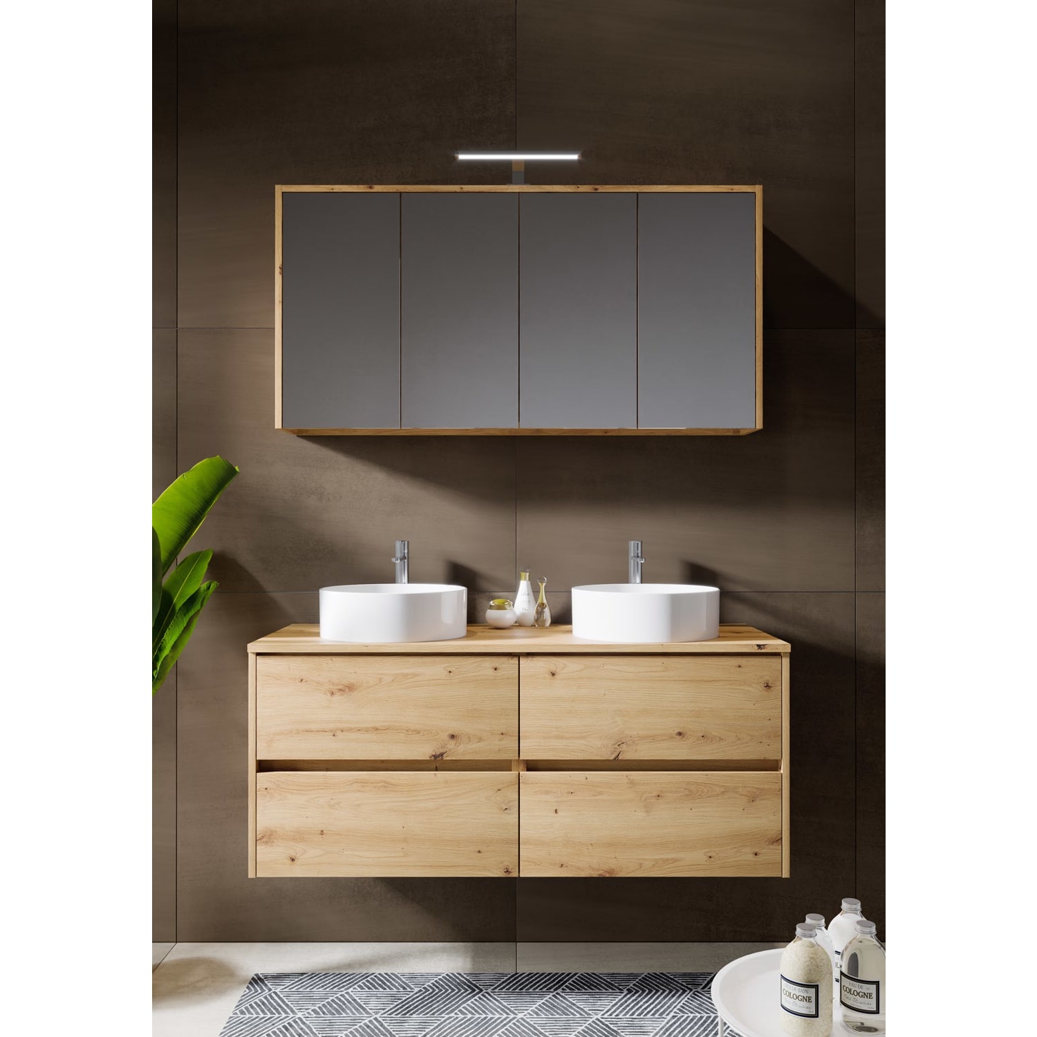 Riho Porto Bowls Badmöbel-Set mit Unterschrank mit 4 Schubladen, Waschtisch und Spiegelschrank, 120 cm