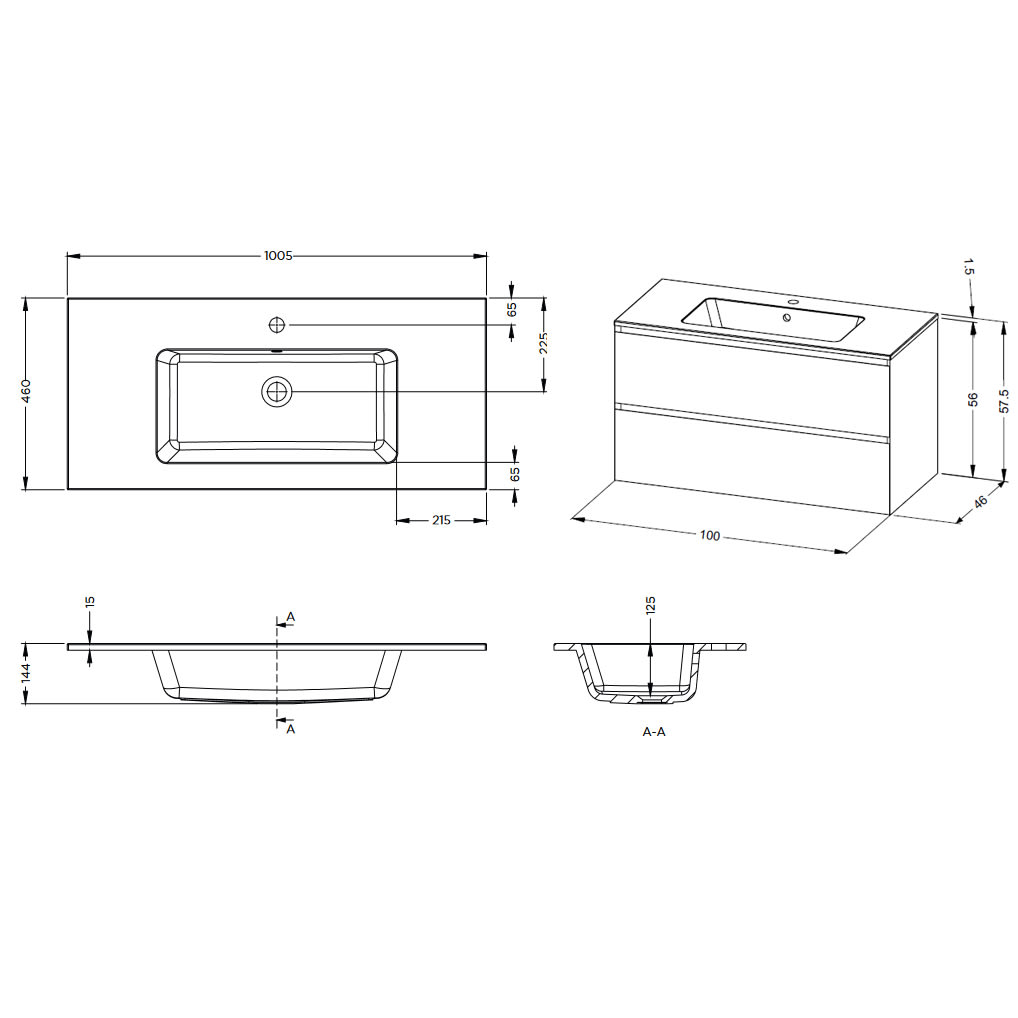 Riho Spring DEW Waschtisch mit Unterschrank, 2 Schubladen, mit Gehrung 100 cm