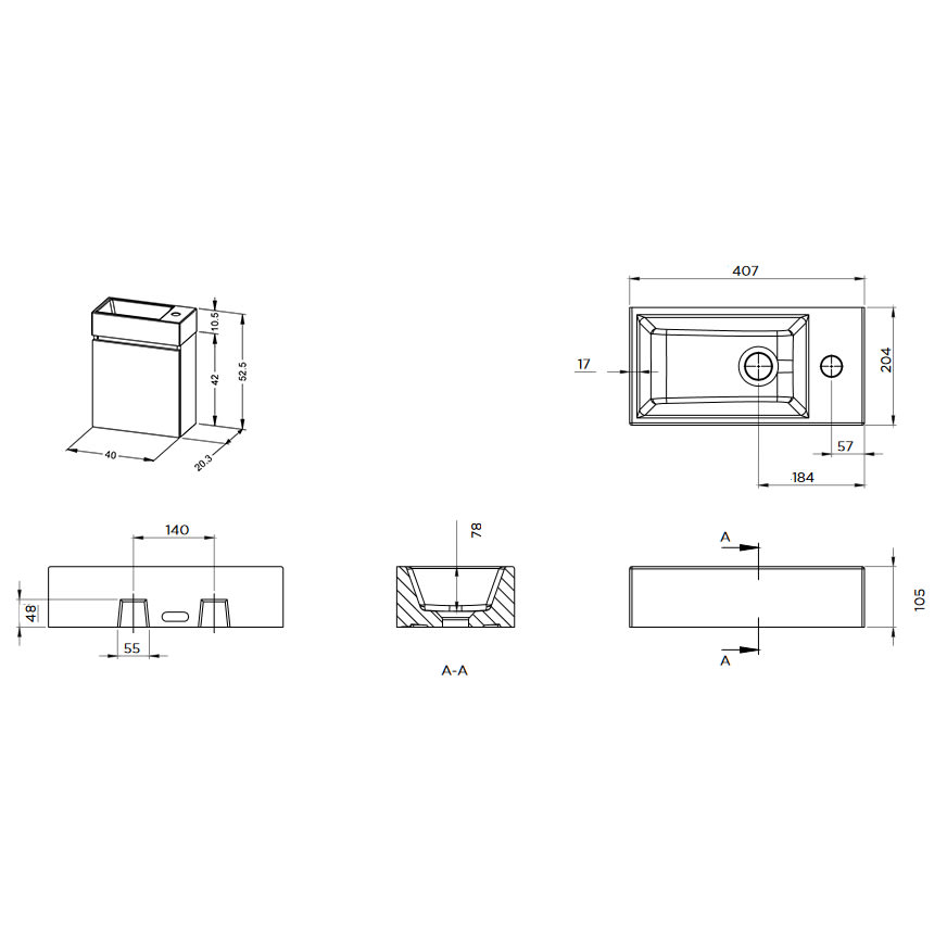 Riho Spring RISE Waschtisch mit Unterschrank für Gäste WC, 1 Tür, 40 cm, mit Gehrung, Becken links