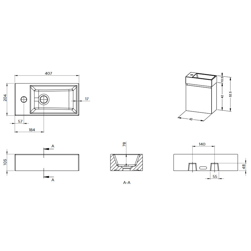 Riho Spring RISE Waschtisch mit Unterschrank für Gäste WC, 1 Tür, 40 cm, mit Gehrung, Becken rechts