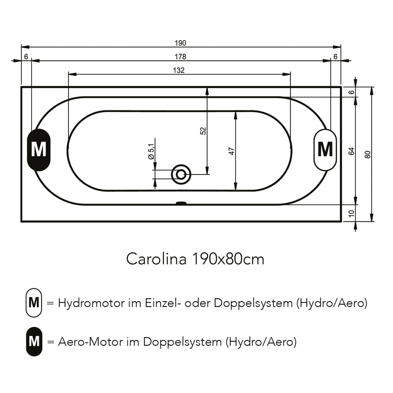 Riho Carolina 190 x 80 cm Easypool 3.1 mit pneumatischer Bedienung