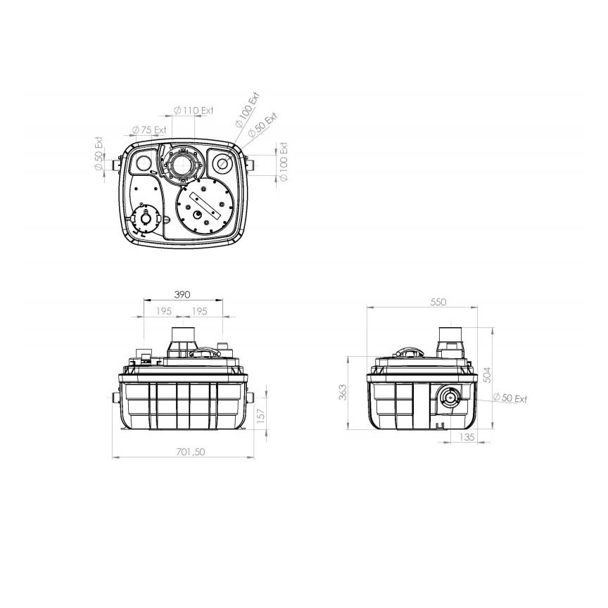 - Einleitungsöffnung: 3 x DN 100/ 50/ 40