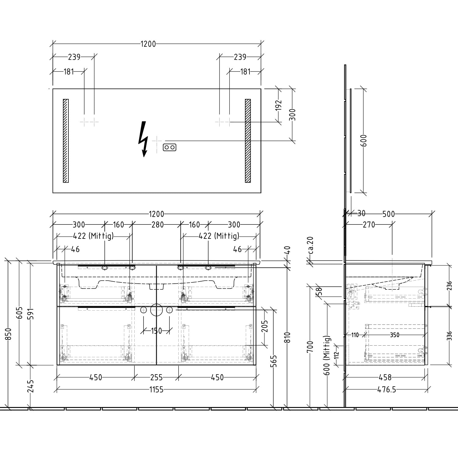 Waschtisch nur mit Möbeln montierbar, keine freitragende Montage möglich.