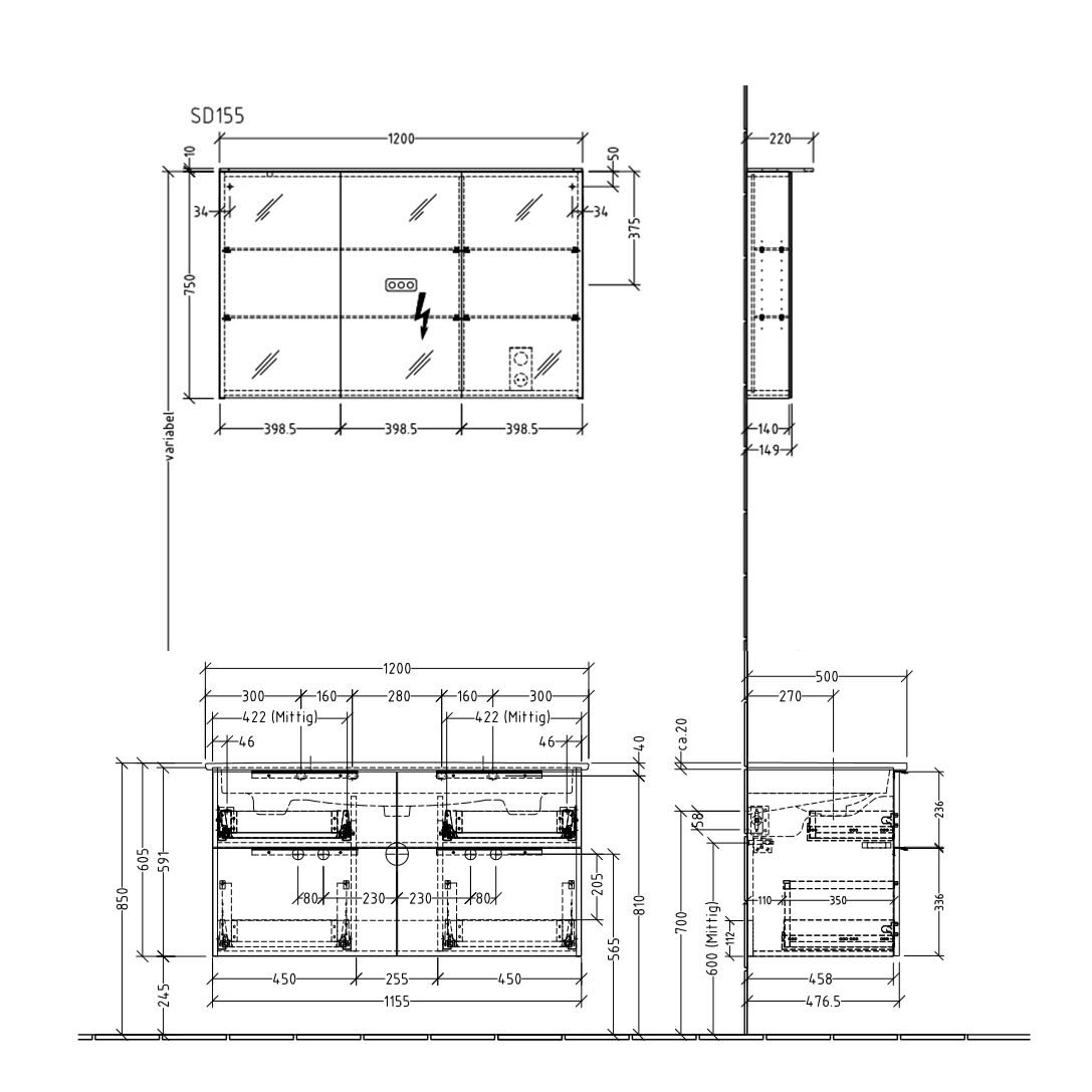 4 Auszüge mit Aufsatzgriff, Spiegeltür Mitte Anschlag rechts, Doppelwaschtisch