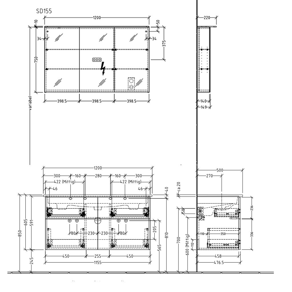 - Breite:115,5 Gesamttiefe: 47,7 Höhe: 59,1 cm, Korpustiefe: 46 cm