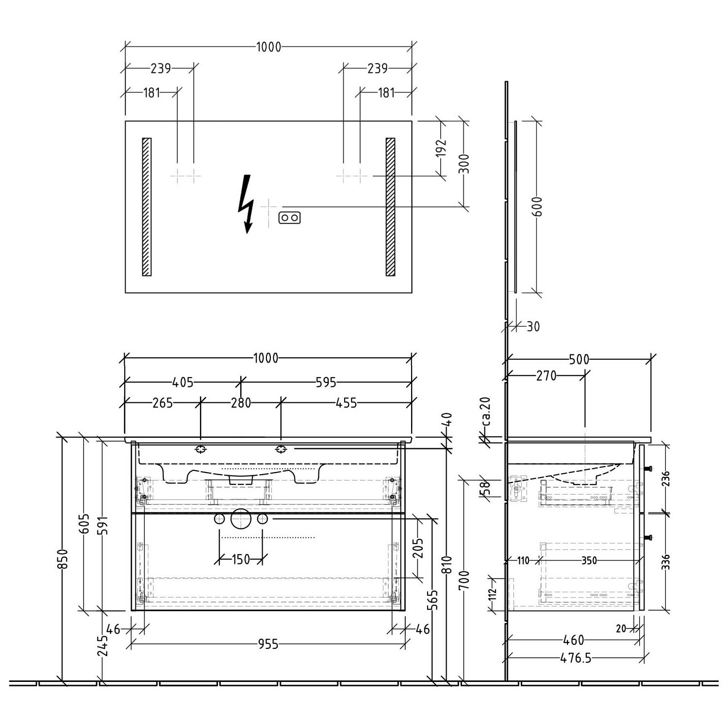 - Breite: 95,5 Gesamttiefe: 47,7 Höhe: 59,1 cm, Korpustiefe: 46 cm