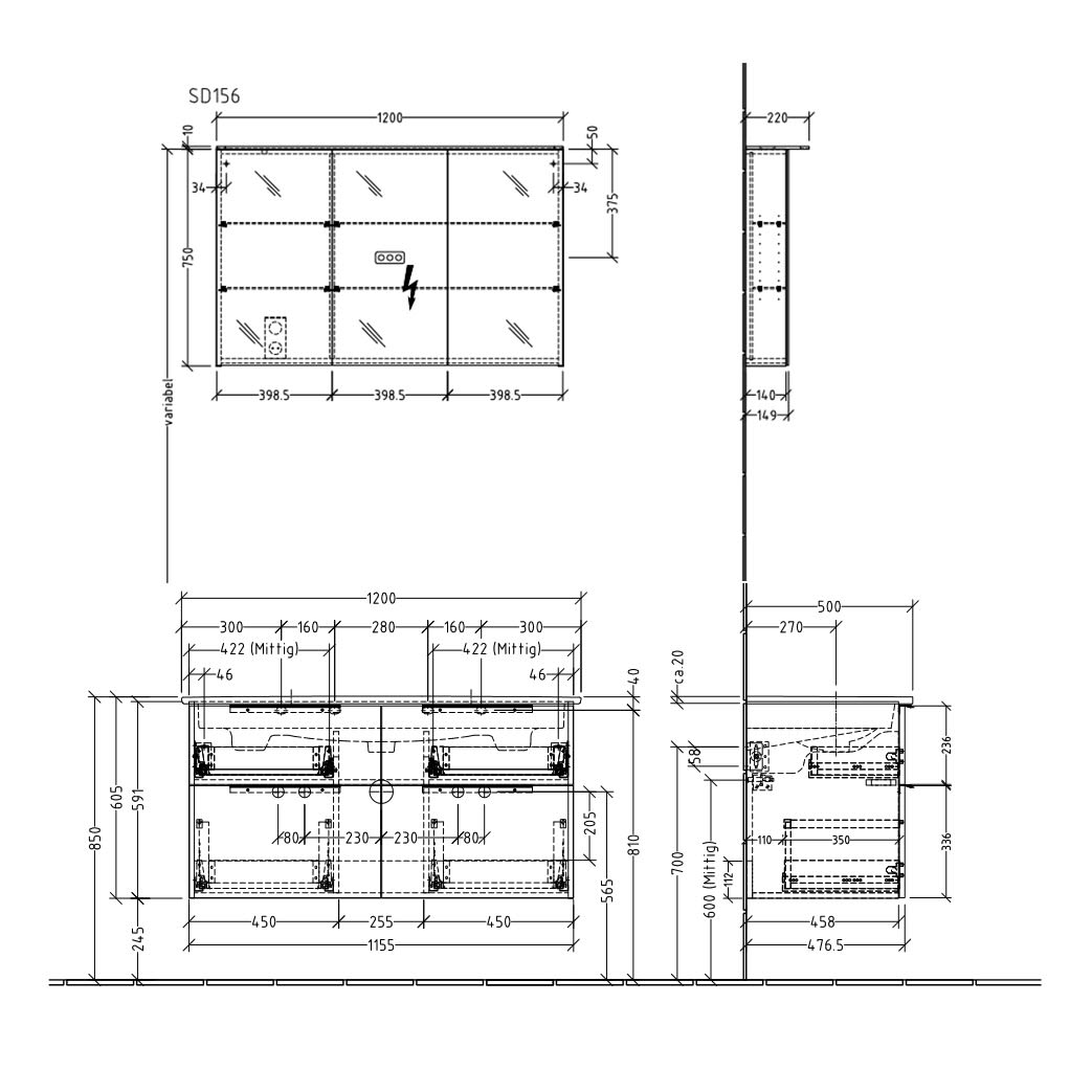 4 Auszüge mit Aufsatzgriff, Spiegeltür Mitte Anschlag links, Doppelwaschtisch