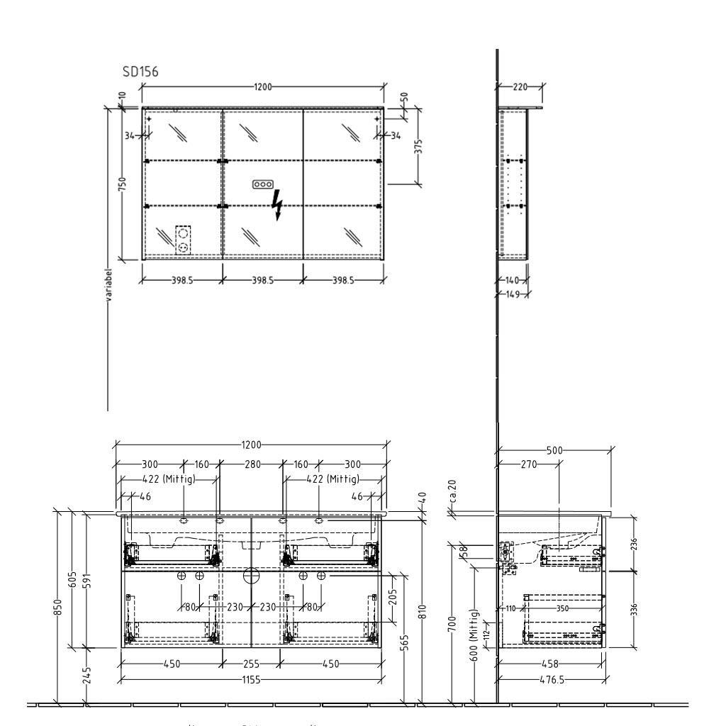 Zum Öffnen der Auszüge planen Sie bitte seitlich links und rechts einen Wandabstand ein!