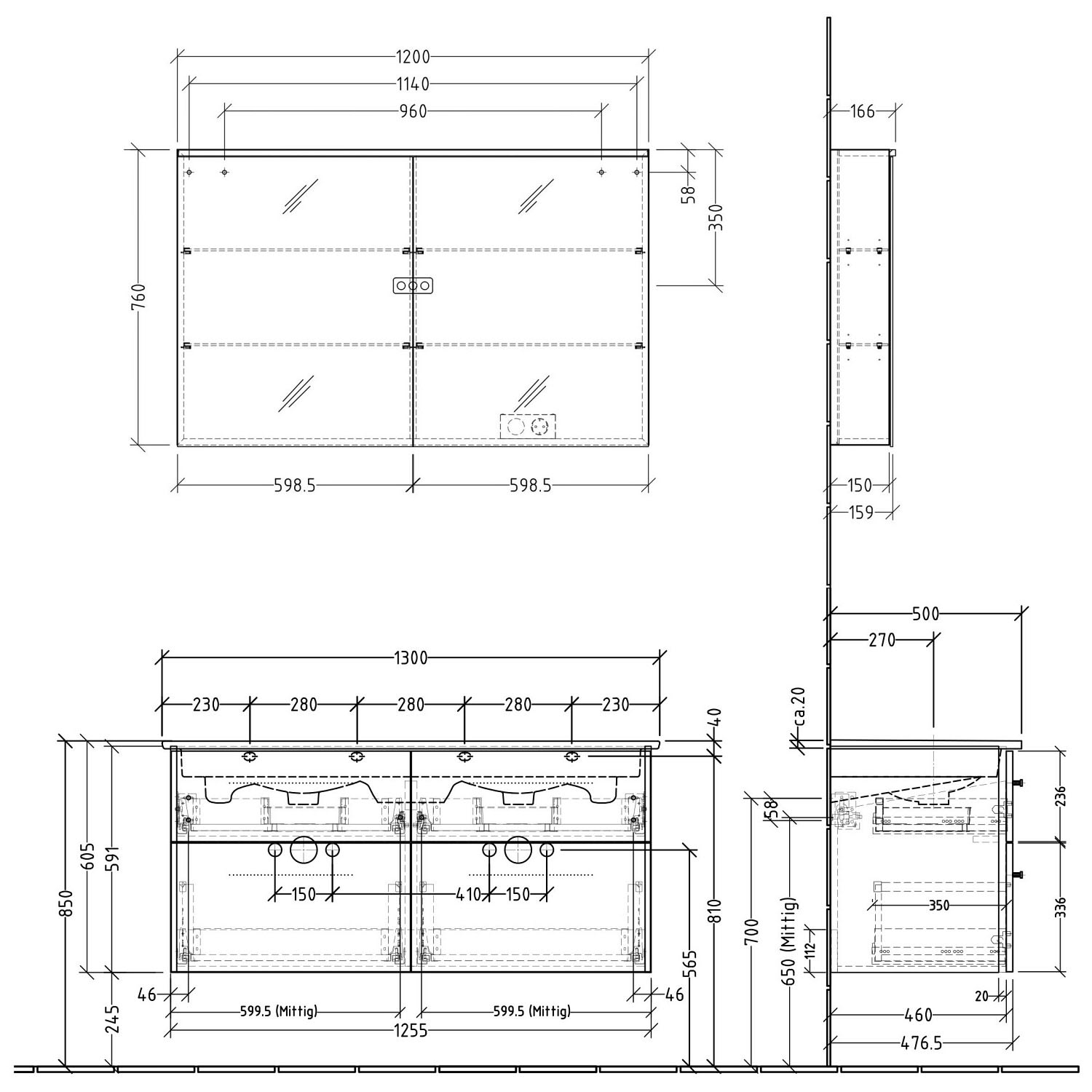 - 2 Spiegeltüren beidseitig verspiegelt mit rundum geschliffenen und polierten Kanten