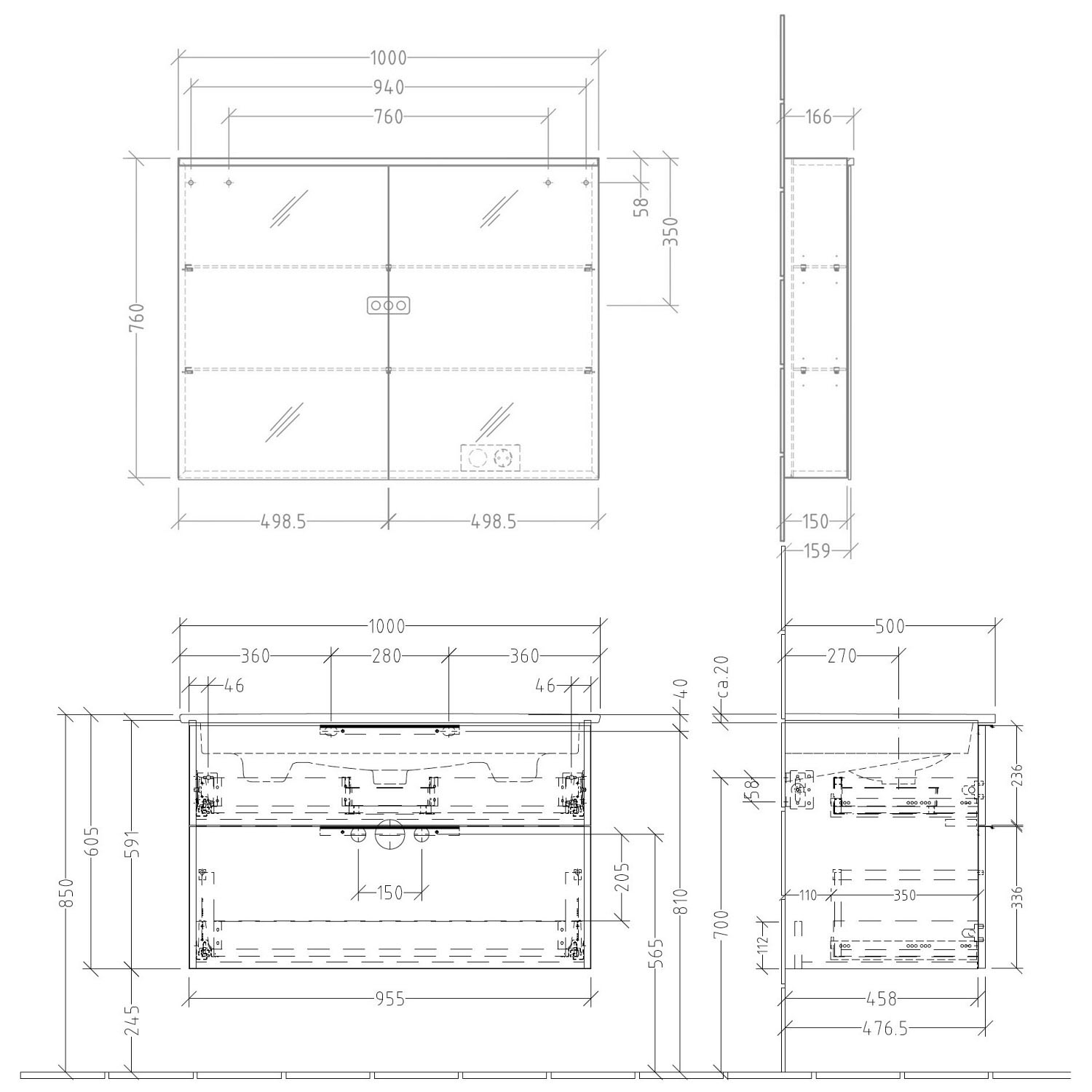 - 2 Spiegeltüren beidseitig verspiegelt mit rundum geschliffenen und polierten Kanten