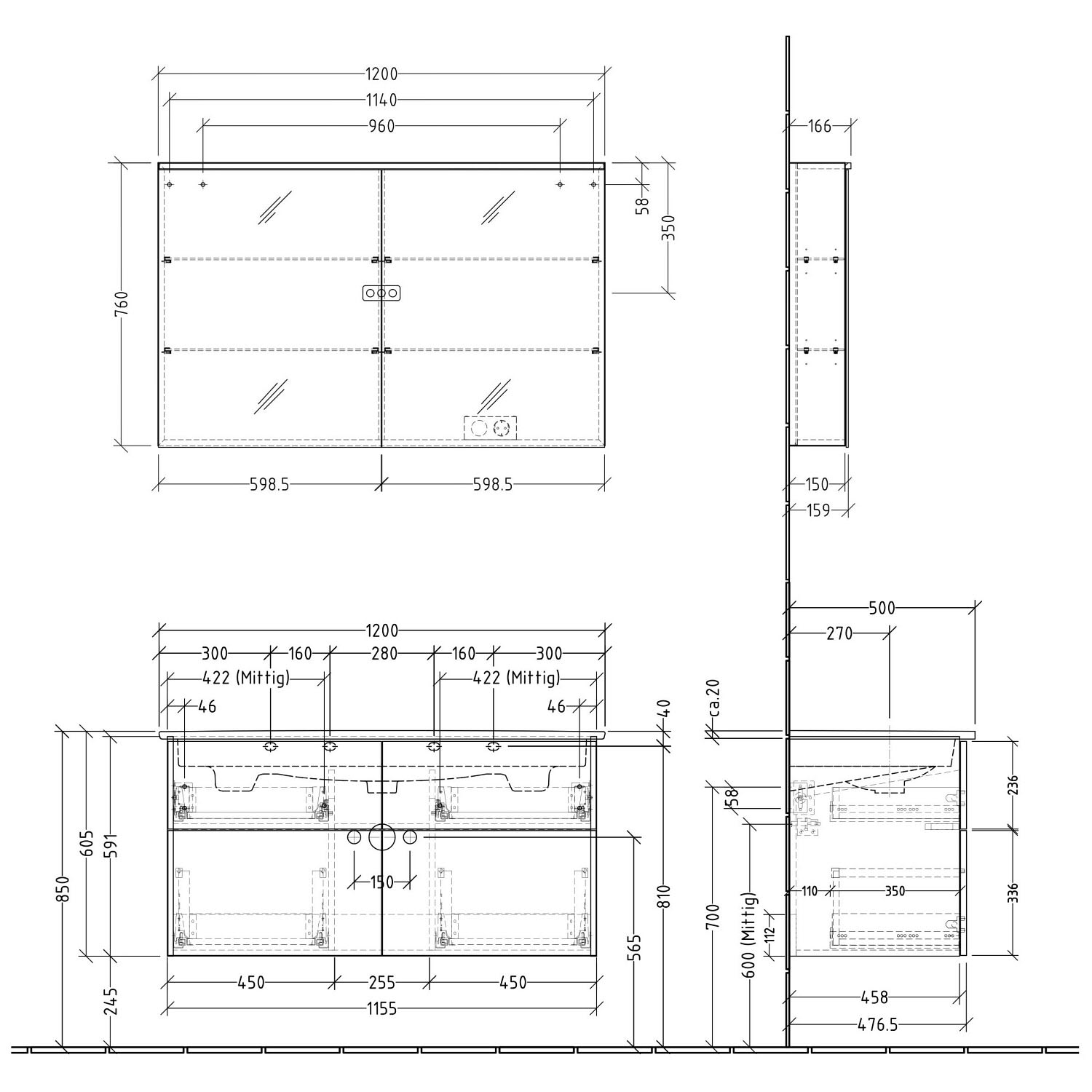Waschtisch nur mit Möbeln montierbar, keine freitragende Montage möglich.