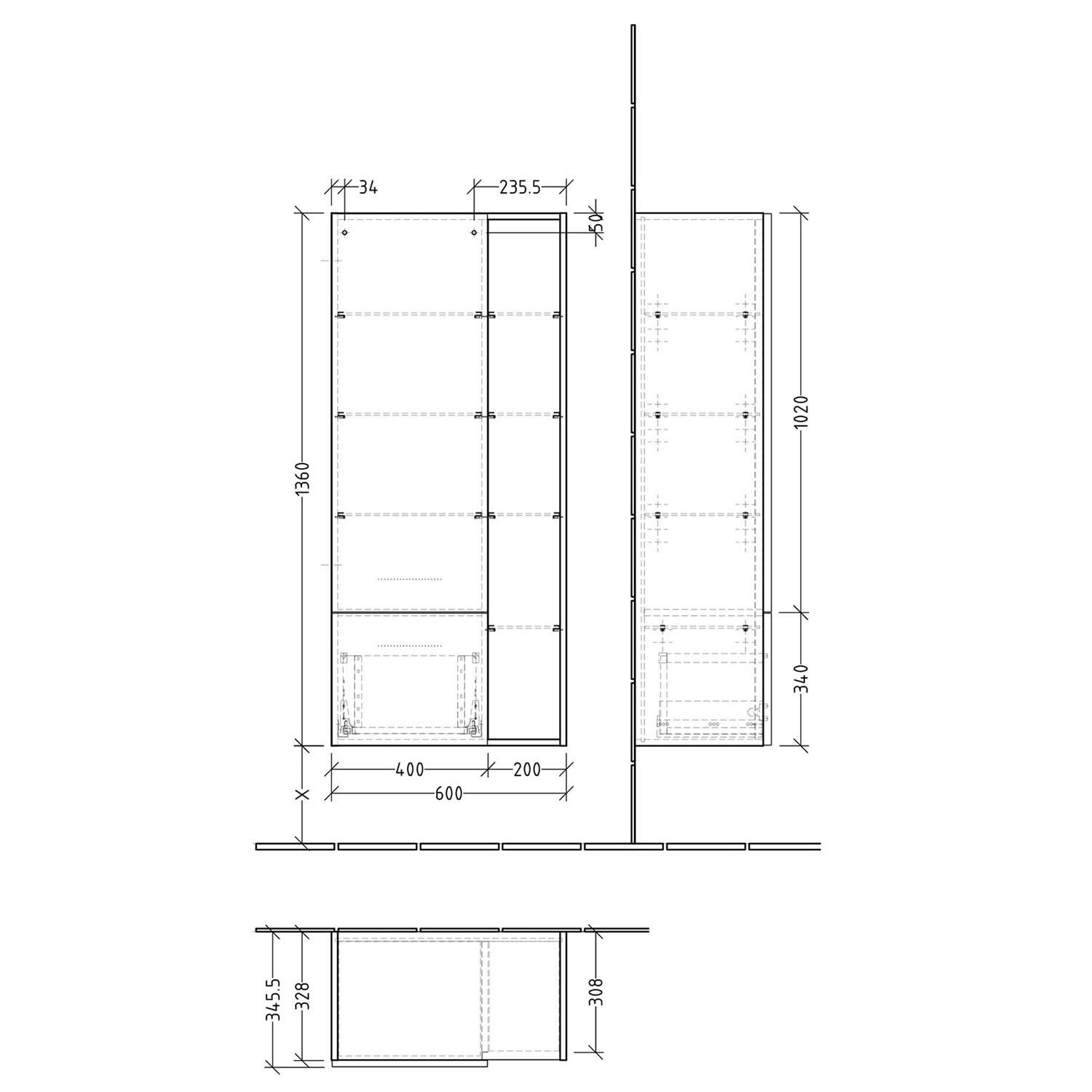 Sanipa 3way Stauraumschrank 60 cm, 1 offenes Fach rechts, 1 Auszug, 1 Tür mit Türanschlag links
