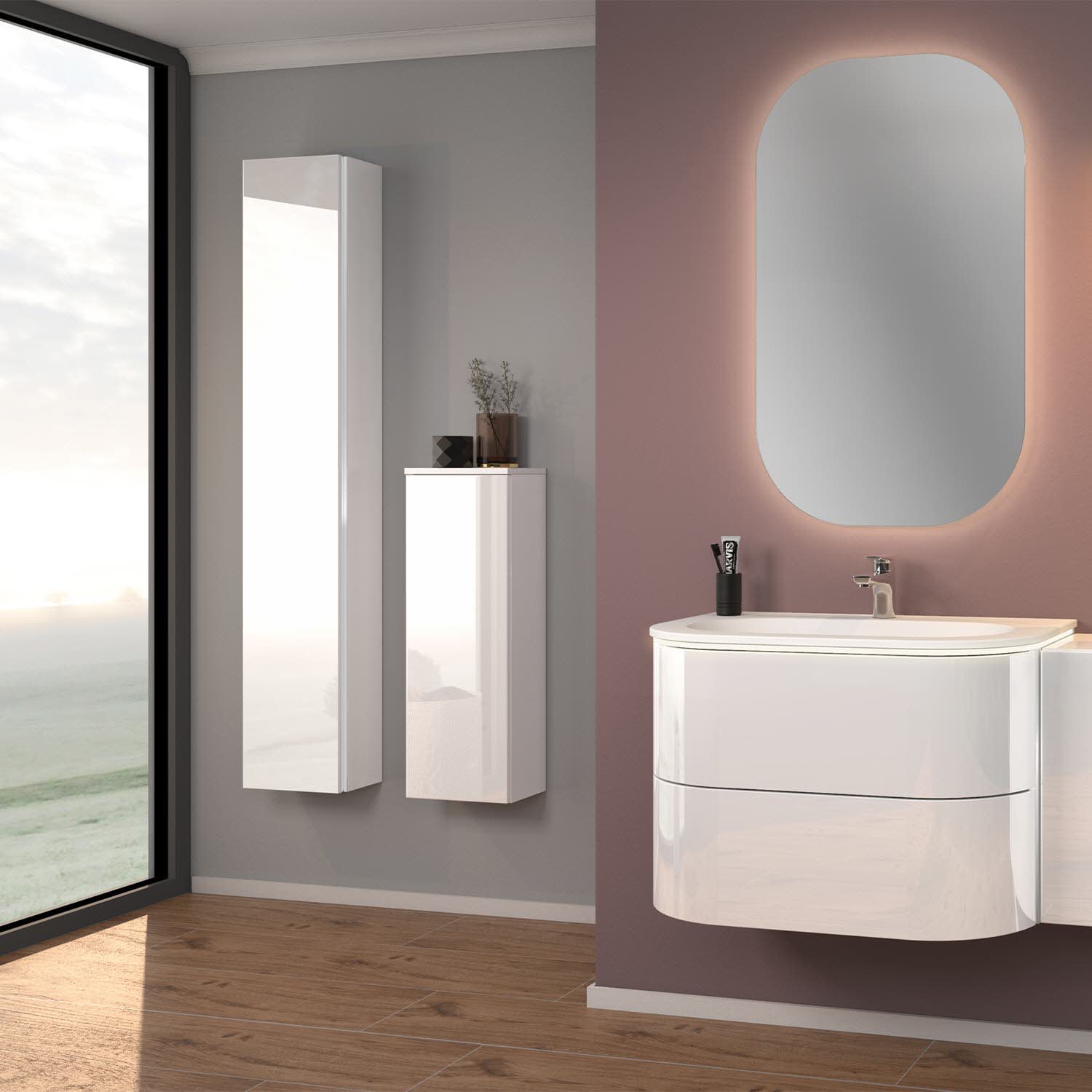 Sanipa 3way Hochschrank 30 cm tiefenreduziert, 1 Tür Anschlag links, mit Griffleiste