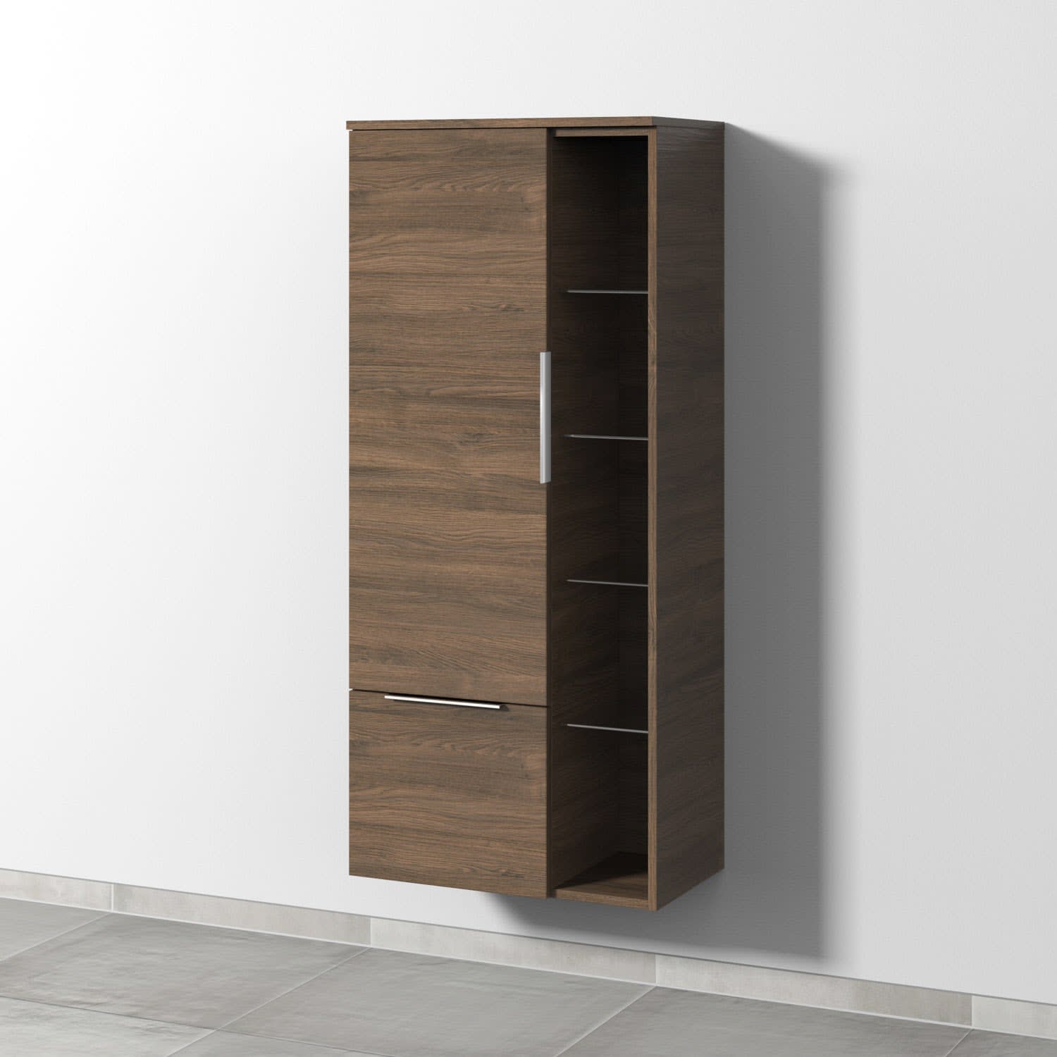 Sanipa 3way Stauraumschrank 60 cm, 1 Tür Anschlag links mit Aufsatzgriff, 1 offenes Fach, 1 Auszug